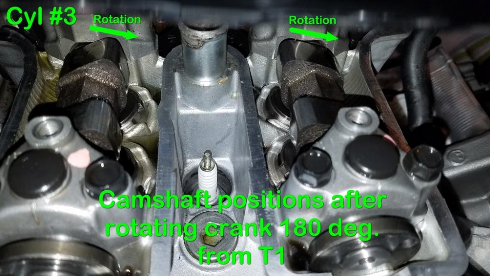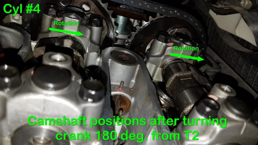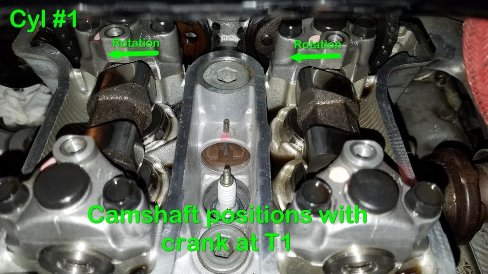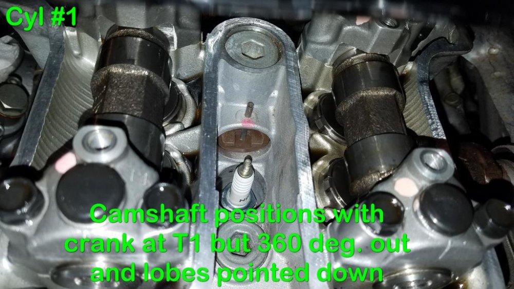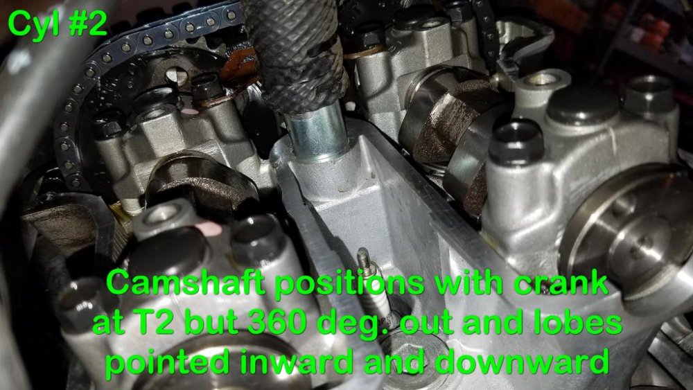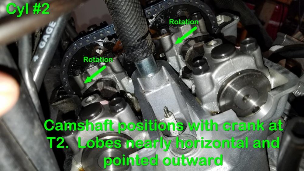 Here are pictures that I took of the camshaft and lobe positions while following Yamaha's method of indexing off of T1 and T2 on the crank. This picture shows the position of Cylinder #1 camshafts with the crank at T1. The lobes are pointed inward and upward. This pictures shows the position of Cylinder #1 camshafts with the crank at T1 when the crank is 360 degrees out and the cylinder is not at TDC at the start the combustion cycle. Notice that the lobes are pointed downward. The exhaust valves are almost closed and the intake valves have started to open. This is not the correct position to start at T1 and begin alignment for Cylinder #1 . O.k. Assume we're back at the correct crank rotation. This picture shows the position of Cylinder #3 camshafts after the crank has been rotated 180 degrees from T1. This is the position to measure Cylinder #3 valves. Notice the lobes are pointed inward and upward much like Cylinder #1 . This picture shows the position of Cylinder #2 camshafts after rotating the crank 180 degrees plus an additional 70 degrees from the measuring position for Cylinder #3 , and aligning with T2 on the crank. Notice the lobes are almost horizontal and are pointed outward from the center. This pictures shows the position of Cylinder #2 camshafts with the crank at T2 when the crank is 360 degrees out and the cylinder is not at TDC at the start the combustion cycle. Notice that the lobes are pointed downward and inward. The exhaust valves are almost closed and the intake valves have started to open. This is not the correct position to start at T2 and begin alignment for Cylinder #2. O.k. Assume we were back at the correct measuring position for Cylinder #2. This picture shows the position of Cylinder #4 camshafts with the crank rotated an additional 180 degrees from the measuring position for Cylinder #2. Notice the lobes are almost horizontal and pointed outward, much like the lobes for Cylinder #2. The correct rotation steps, then, are: 1. Align to the correct T1 position for Cylinder #1. Measure Cylinder #1. 2. Turn the crank 180 degrees. Measure Cylinder #3. 3. Turn the crank to T2, which ends up being 180 degrees plus an additional 70 degrees. Measure Cylinder #2. 4. Turn the crank 180 degrees. Measure Cylinder #4. I note that the lobes are in different positions for Cylinders #1 & #3 (pointed upward and inward) than they are for Cylinders #2 & #4 (almost horizontal and pointed outward). If the official Yamaha instructions have us measuring at different points on the base radius of the lobes--Cylinders #1 & #3 more on the bottom of the lobe and Cylinders #2 & #4 more on the side of the lobe--that would seem to indicate that it's acceptable to measure anywhere on the base radius of the lobes. That includes skipping the official measuring method and just turning the crank on each cylinder until the lobes are pointed straight up (as others have suggested).