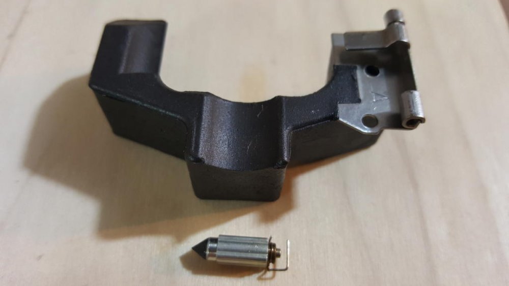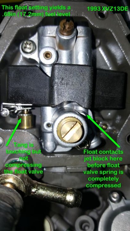 I'm trying to adjust the floats on my '93 Royale and I'm running into problems. I adjusted my floats dry on the bench using this procedure (see pic). Float not compressing the float valve spring. Gap measured on the right side of the float as pictured. I set them all to 28.5mm clearance. I created a wet test setup to test the carbs. I leveled each carb independently before measuring. I let the carb fill with fuel and then drained a little off through the drain valve to ensure the float was working properly. I also tapped the carbs and drain line to ensure there were no bubbles. Then I drained the test line and positioned it directly beside the diaphragm cover and held it firmly in place. I opened the fuel drain screw, let the tube fill, tapped the tube a couple times, and made a mark at the bottom of the meniscus. I measured with calipers from the fuel level mark to the piston valve center mark. Even after testing each carb twice, this 28.5mm dry float setting left me with high gaps (low fuel heights) of 21.3mm, 18.6mm, 17.7mm, and 18.1mm. The manual says 15.5mm to 16.5mm is correct. I split the carbs apart and started to adjust the float height on carb #1 (the 21.3mm gap). After adjusting and wet testing carb #1 twice, I'm running out of tang adjustment. The setting pictured here still only gives me a 17.2mm gap. When I do push down on the float, the float contacts the jet block before the float needle spring is completely compressed. (I can only compress the spring about halfway in this current setting.) I think the tang would almost be touching the float body or the float would contact the jet block before I could get it adjusted to the point that it would give me a 15.5mm fuel gap. See this pic: The bike has 40K miles on it, and the float and float valve appear to be in good shape. The carbs have been thoroughly scrubbed and the float valve orifices are clean. I'm the second owner. Do these look like standard parts? If the float valve were failing, I would expect it to let in more fuel than desired rather than less. Also, if the float were losing its buoyancy, I'd expect to get more fuel than desired, not less. It's as if I have a super buoyant float that wants to close the float valve much sooner than desired, and I'm running out of adjustment on the tang to stop the valve from closing so soon. Or, the float valve is too long and is closing too soon, despite having adjusted the tang down as far as possible. What do you suggest I do next to get this float adjusted properly?