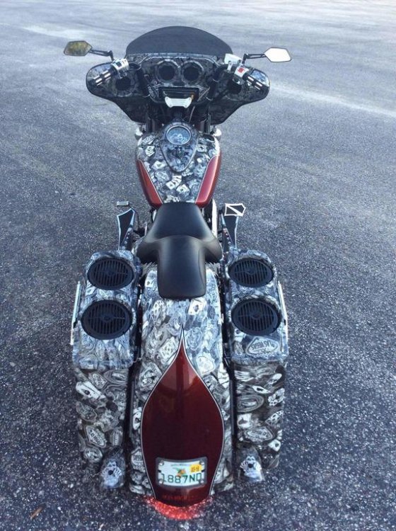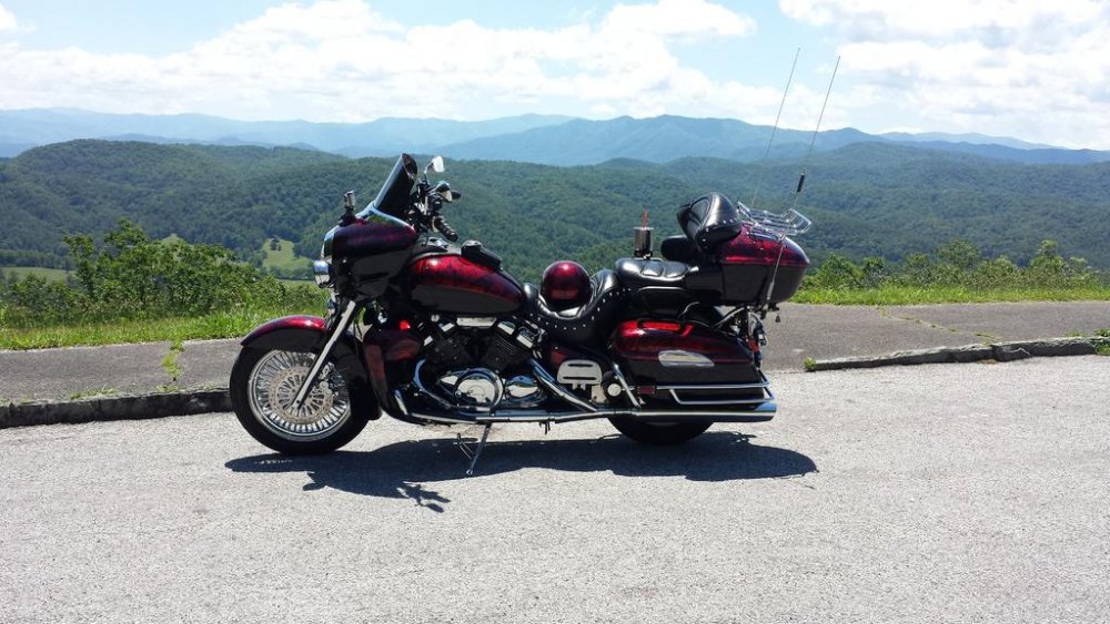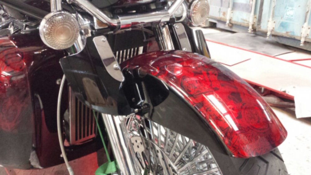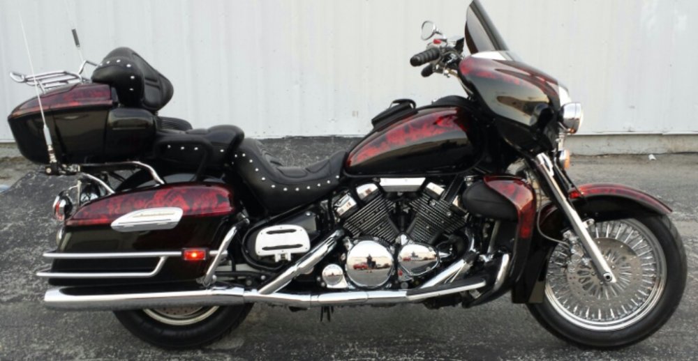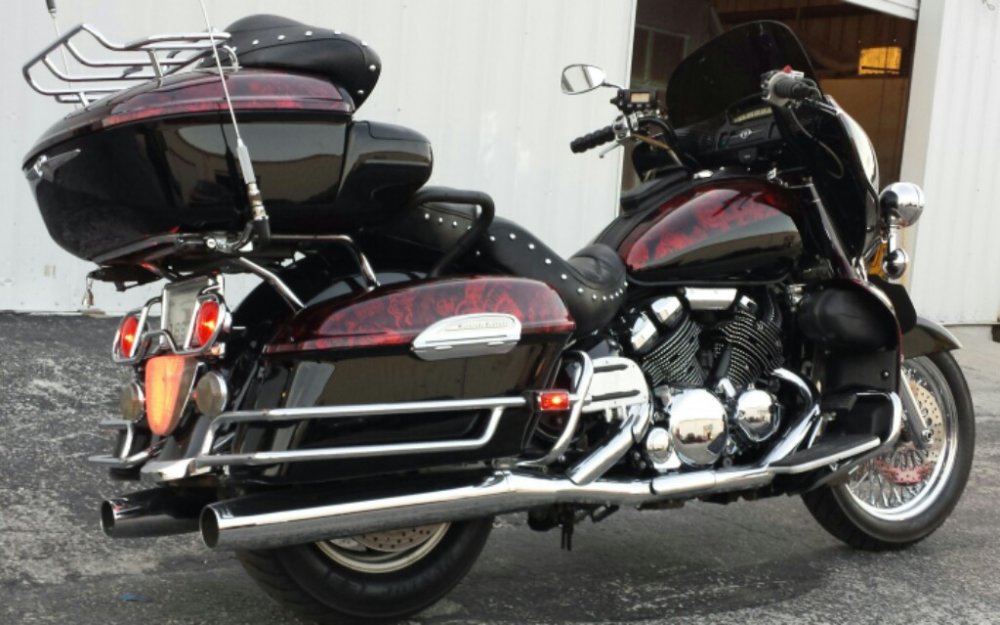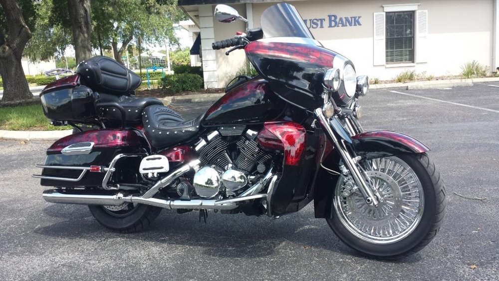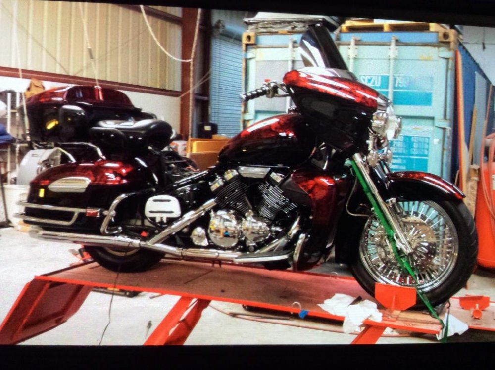New to the group. Thanks for the add. I just sold my Custom built Road star Bagger and decided to by a venture to customize. I haven't really seen one yet. Purchased this 01 3 weeks ago and it has come a long way in the last 2 weeks. Adding 18 inch 48 mammoth wheel, matching rotors, chrome R1 calipers, steel braided lines, Harley FL front fender, the diamond cut guy head covers, chrome Allen head engine bolt kit, 10 inch Bagger bars, chrome hand controls, new grips, 10 inch tinted shield, and a whole lot of paint/hydrographic work.