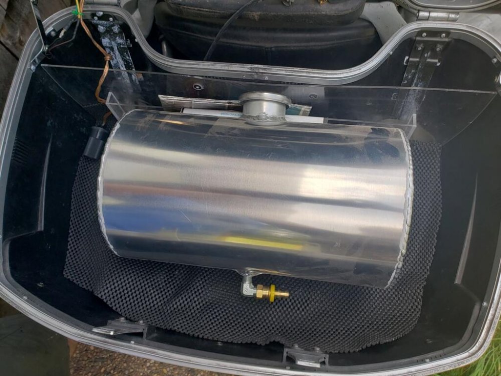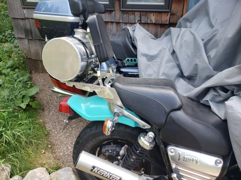 Thank you! I've pushed bikes, paid for gas from random people and been genuinely stuck in the middle of nowhere. Late teens, I hitchhiked while pushing my out of gas XL500, between Rapid City and Nemo SD, and a guy delivering bread and baked goodies to grocery stores stopped and we loaded my bike into this bakery delivery van full of stuff. I figured on leaving the bike and getting a ride to the gas station and walking back, but he insisted we just snag it and go. He dropped me off at a gas station w/the bike, I had .35c to my name, he shook out a couple bucks and a handshake, I couldn't thank him enough. He just said to pay it forward. I was so broke, it was the 80s here and no jobs, but I so wanted to ride. How far can I go on the .72c I found between the couch cushions? I'd find out. I would love a 300+ range. I have an FZ which has a small 3.7 gal tank, but in most other regards should be able to be sport/distance ridden. If it passes the tour muster test I'll have to fix that with another couple gallons at least. I'm going to check but I think this one is a 1.5 or so US gallon. That would have saved my ass so many times over the years, not even kidding. Walking miles under the blazing hot sun gives a person time to reflect on things like this. I did a lot of this before cell phones and GPS, I really often had no idea where I was, where I was going or how far until gas. Sometimes I still dont pull out the phone, I just want to go. If I start to see a bit of traffic I go another way, thats my GPS. You can get these in other shapes and might be able to pack 3 gallons and still have some trunk space. This one is round because I thought it might be in character for the Vmax more than a rectangular fuel cell. I just never used it. Some of these sellers will make the size you want, with the necks/fillers where you want then and it's not that expensive considering what you get. -
