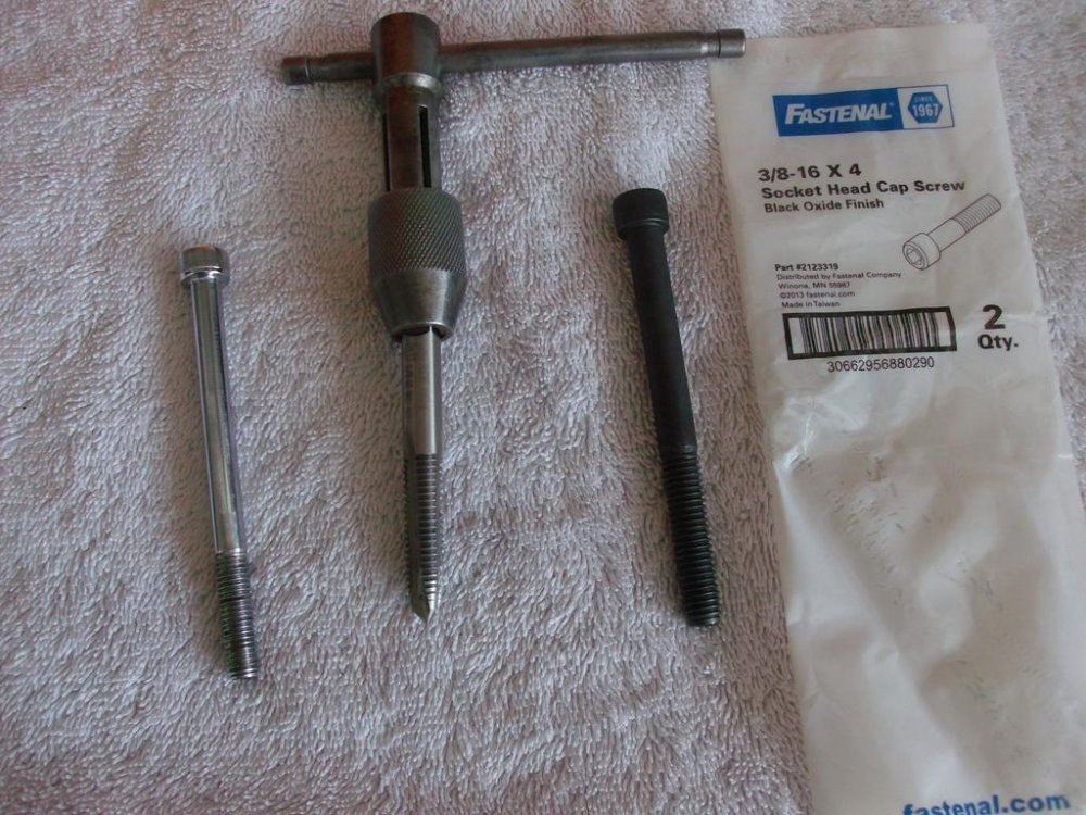 So you found you have a stripped out hole in your frame where the mounting bolts go for the passenger hand rail. Good news: It can be easily repaired. Goldwing 1800 frames are powder coated after all the holes in the frame are tapped at the factory, making all threaded holes in the frame very easy to cross thread if you are not careful. The mounting bolts that hold the Goldwing passenger hand rails or passenger grab rails on, can easily bind and strip out. This is especially known to happen on the left hand side hand rail due to the repetitive load or strain being placed on it during lifting of the bike when placing the bike on its center stand. The hand rails are held on by inserting steel bolts into an aluminum powder coated threaded hole. During manufacturing assembly, the powder coating inside the hole is stripped away when they insert the steel bolts. The tiny bits and pieces of powder coating remain lodged in the threads of the bolt and frame until the bike owner or dealer removes the bolts for the first time. Even then, not many even think of cleaning the mounting hole in the frame or the threads off of the bolt before reinserting it which adds to my point of it being very easy to strip out one of the mounting holes in the frame. So, how can one repair a stripped out handle hole in the frame? There are a few options available. You could purchase and install a Heli-coil to replace the defective threads. M8 x 1.25 is the size needed and you can reuse the stock bolts. You can purchase a Heli-coil kit which includes the tap, the bit, and the insert tool, and a bunch of the insert threads. You will have enough to do all yours and some of your friends. Or you might find just the individual inserts but you have to have the right tap and bit. Other options include the installation of Timeserts and Keenserts which seem a little more substantial than old style Heli-coils. Check out installation videos on both by doing a search on Google. The aft handle hole on the left side of my bike was stripped out by previous owner. I did not notice this of course until I went to remove the seat from the bike. The repair option I chose, was not to reinstall the metric bolt, but to install the next size larger bolt than the metric which was a 3/8-16 standard thread socket head cap screw (Allen head bolt- see attached pic). After removing the seat from the bike, using plastic baggie, I created a protective barrier around the aft left handle mounting hole in the frame so that metal chips could not fall down inside or outside the bike frame during drilling. I then used masking tape and securely taped down the end of my shop vacuum on the inside of the frame so it could suck the chips out as I slowly drilled the hole to a larger diameter of .3125 which is required for the 3/8-16 tap. Next, using the 3/8-16 tap with a little oil on the end, I slowly and carefully tapped the hole. After the tapping was completed, I did a trial and inserted and then removed the new mounting bolt and “Wha-lah”, it fits. Next I removed the vacuum end and made sure the area was indeed cleaned of metal chips / debris before I removed the protective plastic barrier from the frame. To ease the seat / hand rail bolt installation: If you have a grinder, you can “taper’ the ends of the bolts to make aligning the bolts easier or you can purchase Chrome Tapered bolts for around $15.00 on line, (see last pic).