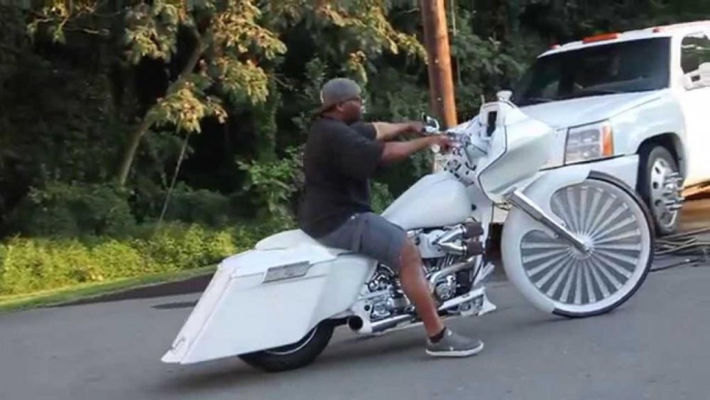 Harley Davidson with 30 inch chrome "floating" front wheel. http://think-man.info/wp-content/uploads/2015/11/011.mp4?_=1