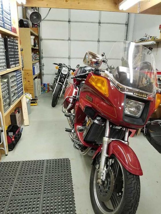 Hello everyone, I finally got around to shaking some photos out of my phone and wanted to show off my new project, I've been lurking a while and thought it was time I said something. Ya'll seem like a decent bunch so if you don't mind I'll elbow up and open my mouth. Almost a year ago I found this beauty on craigslist for a price that looked too good to be true. Turns out it only had 4th and 5th gear, wouldn't shift below that. Having experience with the XS1100's it sounded to me like the shift pin issue which is about a $40 fix. We had just started a major remodel on the house and I had no time for a new bike but I had to have this one, I've been bringing bikes back to life since I was a kid and of all the bikes I've had the one I wished I hadn't let go was an '83 Venture. Best all around bike I've ever ridden, I think of it as a full-dress sport bike. I'd go on but I think I'd be preaching to the choir. The bike had been well cared for by its original owner who garaged it and had all the regular maintenance done by the dealer, including updated items like the water pump impeller. There isn't any rust anywhere except the expected speckles on the exhaust system, the bike is really quite clean considering that the second owner was commuting about 70 miles round trip a day on it for the year he owned it. All I had time to do when I brought it home was shove it into the shop, but over the last few months have squeezed out a few hours here and there and have made some progress. So far I've fixed the shift issue, removed the oil pan to retrieve the shift pin, removed all the engine covers to fix weeping (mostly to polish them, really), pulled valve covers to check valve lash, (all good) flushed the cooling system (which didn't need it), dropped the exhaust for gaskets and welding of the collector mounting bracket, and pulled all the bodywork to fix an incredible number of broken tabs and cracks. There were some very slight scuff marks on the left side of the fairing, slight enough that they came out with a little rubbing compound, but every darn tab on that side was either broken off outright or cracked like a desert, and there were stress cracks at nearly every corner of the fairing. And the headlight trim was broken at the screw holes. My thinking here is that the elderly (and I do mean elderly, I'm no spring chicken) original owner arrived at the end of his riding career with a slow speed tip-over against the minivan or the riding mower in the garage, breaks out a tube of epoxy and sells the bike to the family friend who needs cheap transpo, who in turn sells it as soon as it costs him anything but gas. At this point all the above is fixed but there is more to do before she hits the road. Here is how the bike looks now Upholstery is good except for the usual stress separation on the front seam - 58,00 miles on the odometer While I had the covers off I stripped the clear coat, polished and detail painted the ends and painted the centers with high temp silver - Looks kinda nice peekin out there - The water pump cover "before", the "after" is above - Missing shift pin - 70 miles a day. On this tire. The bike starts and runs like a sewing machine, but before it hits the road I'll replace the tires of course, and go completely through the brake system. I like the linked brakes and will retain them, but the calipers, masters, and valves will all come apart and be renewed. And stainless lines, I'm a big fan of stainless lines. Same thing for the clutch. I have an overhead lift setup so while the bike is hanging for tires I'll drop the swing arm and service all that mess. I fixed the weeping forks with the "tool cut from a milk jug" trick, other than some slight weeping they checked out just fine. The forks will be stripped and polished, and I'll probably repaint the bodywork if I have time before summer. Thanks to everyone for all the great info collected here, it's been a great resource and enjoyable reading! I'll post some more when there's more to post, for now its back to the house. Waaaaa. Thanks for reading! Tim