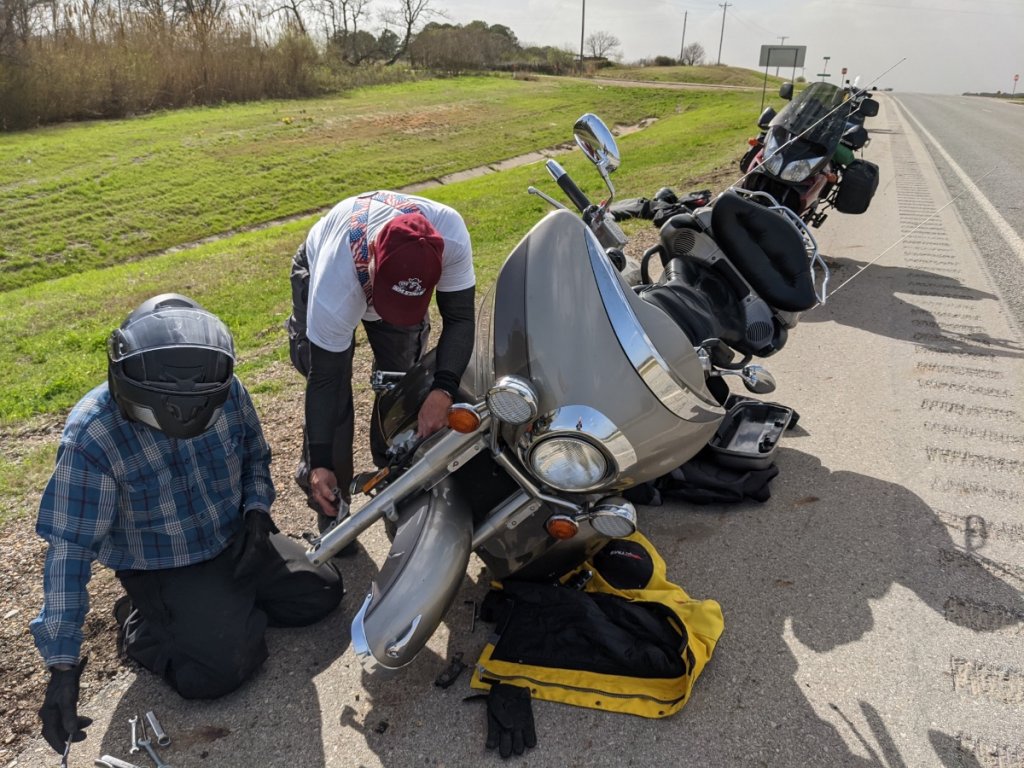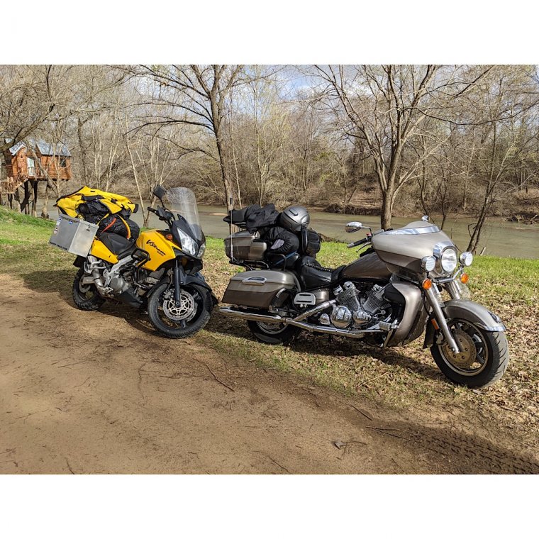 Evening everyone, Wanted to tell you all about a near disaster that occurred on my short bike trip last week. I am a school teacher in Moore, Oklahoma, and last week was our spring break. We didn’t get to take a bike trip last year, so my dad, uncle, and myself decided to take a quick trip over my break to southeastern Oklahoma and stay in the Kriver campground and ride the skyline drive from Arkansas to Oklahoma. On Wednesday, we were only about 12 miles from Antlers, Oklahoma when it happened. At a certain point I felt the steering was acting odd, but I attributed it to some brisk crosswinds. There was a pavement change, and I thought the steering lightened back up, so I figured I was right. About that time, a loud growling noise started and steering got super heavy again. I knew I had a front tire failure and was in trouble, as I was at speed. The handlebars were shaking , but I was hanging on, while trying to slow her down and head to the shoulder. I was almost to the shoulder when the handlebars started shaking violently, which caused a sharp right off the road and into the soft dirt on the side of the road. The dirt was soft enough it caused the bike to come to rest on the crash bars on the left side. I guess my head hit the windshield, because I broke my windshield clean off. I was pretty shaken, but all good physically. Once my dad and uncle got back to check on me and the bike, we assessed the bike. It was in surprisingly good shape, except the front tire was flat, flat. We decided to try to put some air in the tire to get it up on the shoulder of the road, and then make a plan from there. We got the pump out and hooked it to the valve stem...that’s when we figured out what happened. The metal inner piece of the valve stem came straight out of the valve stem. That was my major point of air loss. We managed to get it up on the road, and started making some calls for towing, or possible bike shops. We soon discovered that there was no motor sports shops within 30+ miles that worked on or dealt with motorcycles, just atv’s and sxs. No towing around. We did find a car tire store that could work on the tire, but we had to take them the wheel. My dad came up with a great idea. We took our jackets off and placed them on the ground anywhere the paint might touch the cement. We then laid the Venture over on her side and unbolted and pulled the front wheel out that way. Worked awesome. We then strapped the wheel on the back of my dad’s bike and I rode my uncles bike into town to the tire shop. In about 10 minutes, the dude had the tire off, new valve stem I and tire remounted. They sprayed it all over with soapy water and everything was solid. We loaded the tire and went back to the Venture. Got the wheel put back on , with the bike laying over on its side, reinstalled the brake calipers, as the aired up tire was too wide to fit with them on the fork. We then reloaded all the bikes up, and slowly worked our way to Moyers, Oklahoma, where the kriver campground is. that’s Adam Sandoval’s campground. The tire never lost a bit of air on the way there. Once we got camp set up, I bent the left crash bar back straight, unbolted the lower and matched the lowers back up. Just some scratches on the bottom of the lower is all that you can see. The old bike carried me through the next days ride, and then the ride home safely. We dealt with lots of wind, which also lead to the demise of the chrome strip under the windshield getting ripped off by a big truck gush of wind. The old girl had a tough trip. I’m thankful to be all safe and healthy, and thankful we were able to finish the trip. It was crazy