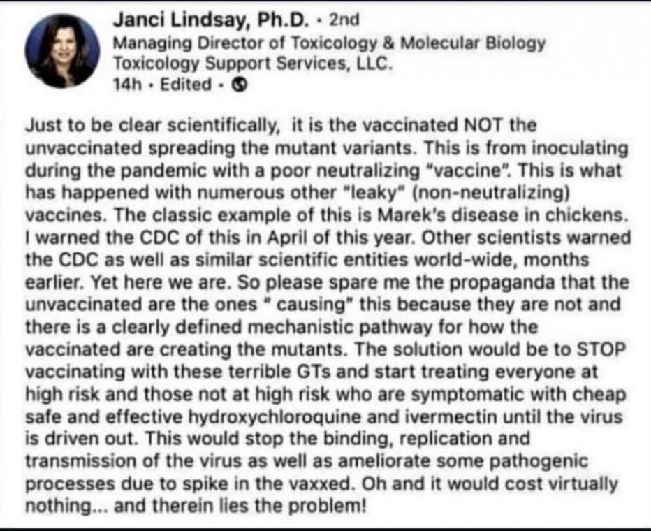 Well it’s pretty obvious her qualifications and insight are far above your opinion. Your opinion is valid in that it is yours however, hers however has earned credibility. https://www.informedchoiceaustralia.com/post/uncensored-dr-janci-chunn-lindsay-ph-d-molecular-biologist-and-toxicologist