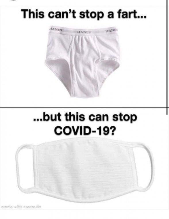 “Peeing” analogy is not accurate by any metric. This one is accurate: Your shorts and trousers do not stop a fart from spreading at all. And yet a scent molecule is far far larger than a virus. Its like trying to stop a mosquito with a chain link fence. Now THAT is real smart.