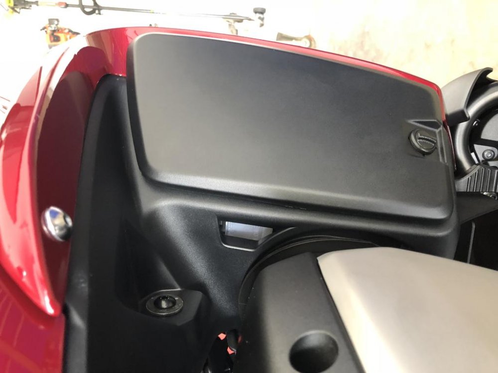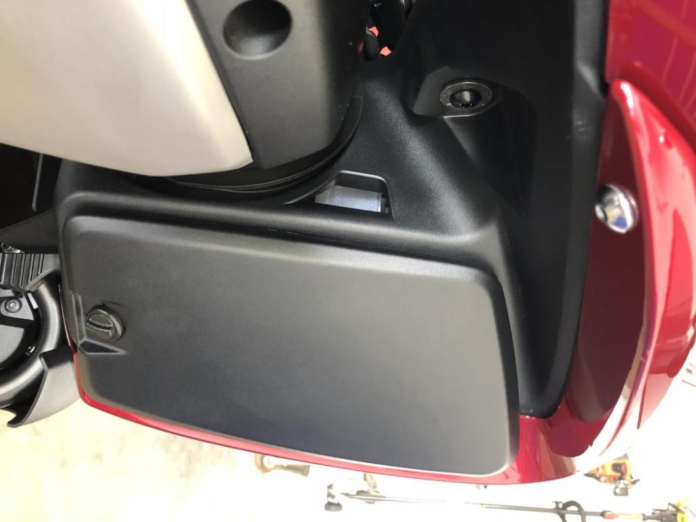 The Star Venture rear brake master cylinder reservoir is located inside the right lower fairing. If you look at the attached photo you will see a square hole to the left of the access panel on the right lower fairing, that hole allows you to see the brake fluid level. To remove that access panel you turn the bottom screw 1/4 turn and it should pull out, then you will slide the access panel downward a little bit and it will come off, do not pull straight out on the access panel or you may break the slots that hold it in place. If you need to add brake fluid you will have to remove the access panel. To reinstall the access panel you line up the slots and slide the panel upwards a little bit and then put the quarter turn screw back in and secure it with a quarter turn. I don't know why every picture I upload gets rotated a quarter turn any clues?