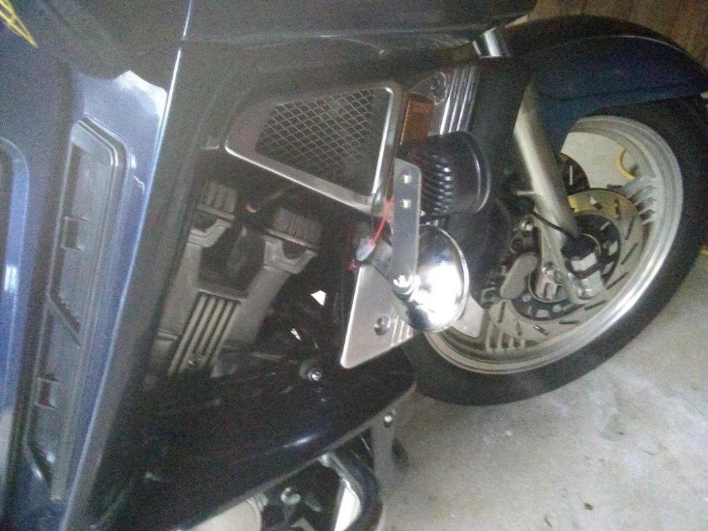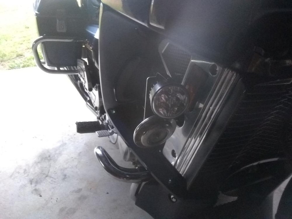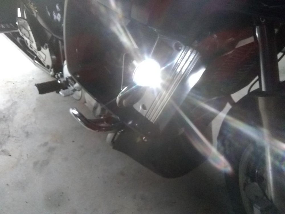 I wanted to add a couple of lights to aid me in vision while on low beam. They beam down then left and right just so I can see the shoulder and center line better at night when a car is coming at me. They consume very little power, fused at 1 amp for the pair, which is a main concern because the charging circuits on the 1st Gens ain't the most robust. Except for a switch along side the CLASS Controller no mods were done to the bike. I can power coat, any color, the attachment bracket.