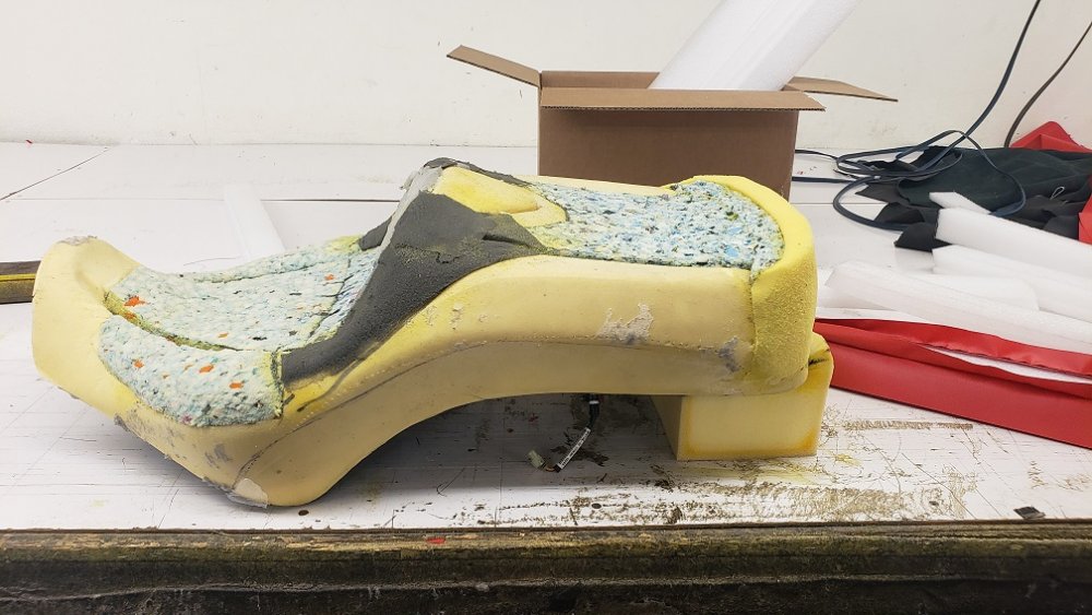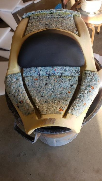 One of the things that I have disliked about my SVTC is the seat. Too soft, gap between the rider seating surface and the backrest there sinks after about one hour giving no support to the tailbone area. The huge drop off and gap on the back of the passenger seating surface. I have always replaced my two Goldwing saddles with Corbin's and loved the firmer padding that takes forever to breakdown...if at all. Not happy with the looks of the Corbin for the SVTC and the absence of factory heat (and about a $1500 price tag) led me to modifying the stock SVTC seat with a local upholsterer. I started by realizing that 99.9% of the time I ride with the adjustable lumbar pad in one place so I measured that distance from the center of the pad to the nose of the seat. Second, I Installed the bracket for the Utopia Backrest and off to the shop I went. I talked at length with Dave at the shop and wasn't too fond of any of his available padding options. SO I went to google and purchased my own Rebond foam in 1" and 2" pieces. SO then we pushed the lumbar pad all the way back, took the cover and pad off and redid the foam so that it filled out to the measurement I wanted to the front of the seat, and added a bit of a slant to the foam. Then the center seating area for the rider and passenger were hollowed out and fitted with the 2" foam. A slant up into the lumbar pad was added for me and then an extension and upward tail curve will be added for seating area for the passenger, after which another section will be sewn into the leather cover that will join with the passenger backrest, eliminating the gap between the two. The passenger backrest will remain the same except that it will be covered in the new leather. in this first picture the rebond foam has been placed into the seating areas on both seat as well as where my thighs are supported. The lumbar pad has already been re-done and is in it's fixed position The second picture shows some of the mock-up of the rear tail section at the start. You can also see the new slant in the lumbar pad and the filler for curving the seating section into the lumbar pad. In this third pic you can see the dark gray foam that is soft and used to fill the gaps around the lumbar pad and is used to shape and fill gaps to make the seat look smoother. The light gray on the lumbar pad is the factory heater. you can also see the tail section in another stage In this last picture there is about 2 hours of work left to the padding part of the project. Here you can see the tail section lip, which will be redone to come up just a bit higher to fill about half the 2' gap between the seat and passenger backrest. Also you can see the curve of the rider seat into the lumbar pad, the gray filler foam and the seams that it will fill. The Utopia bracket will be put back on in this part of the project. I rode it for about two hours like this and it feels soooo much better without any breakdown in the padding. The seat will have the factory heating elements put back on, then the seat will be covered in black leather that has a soft 1/2" foam backing on it. The seating surfaces and the passenger backrest will have the insert stitched with a diamond pattern to provide a touch of pillow like softness over the stiffer foam. It may be finished by the end of this week (waiting on the leather) or early next week. I will post pics when it is all done. About half the cost of the Corbin while still keeping factory heat and the lines of the stock saddle. Thanks Dave