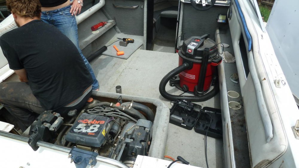 Got the upholstery for the most part tossed overboard, and the engine briefly kicked over and it sounded healthy. We drained the fuel tank (27gallons) about half way and added two cans of Sea Foam, and the kids now have full tanks in their cars. It's coming along...