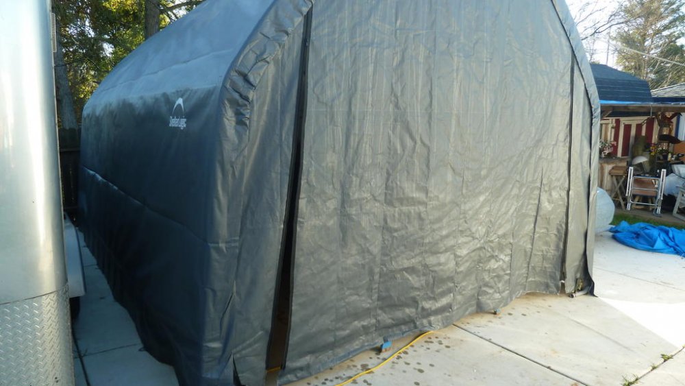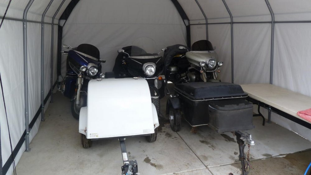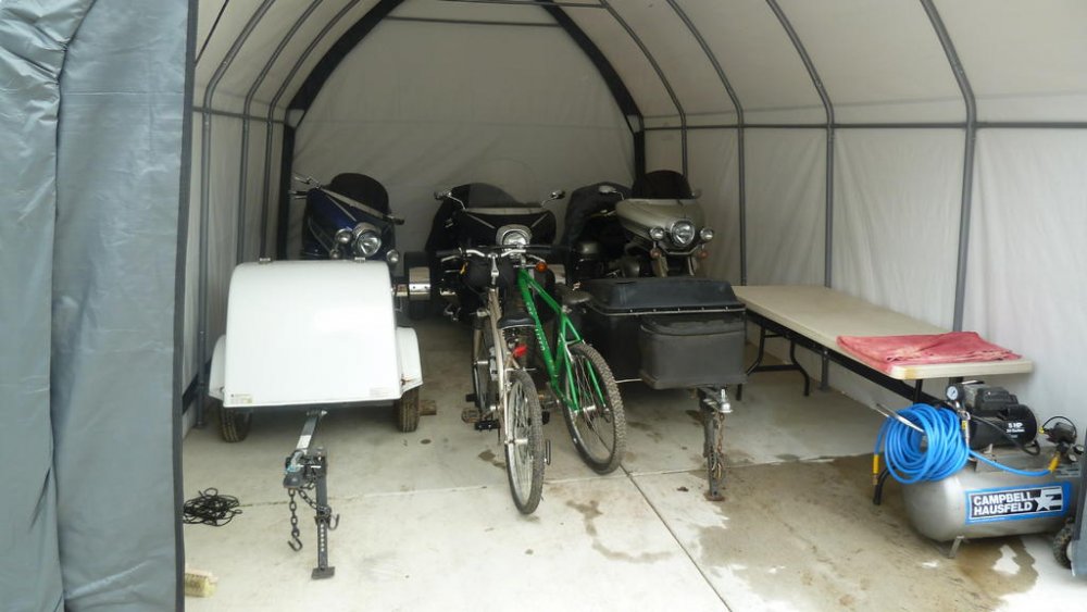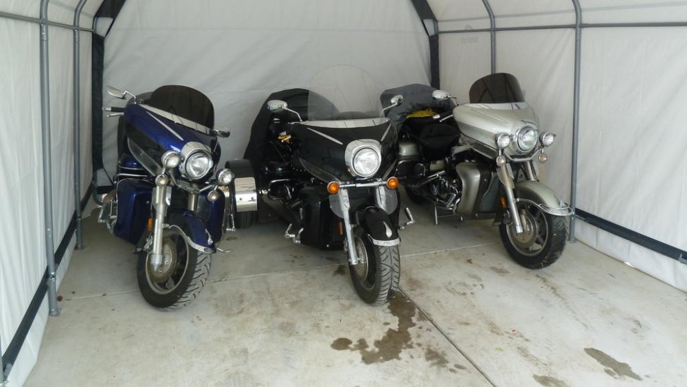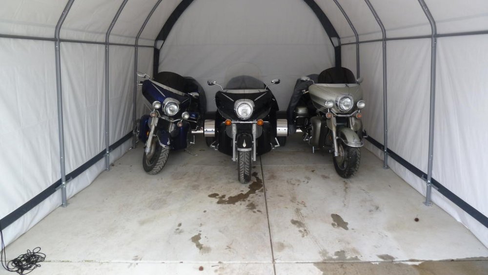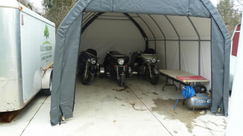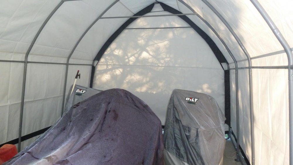 So last year I picked up one of those 10x20 Carson garage/canopies to keep the scoots out of the weather. The thing lasted about 6 months before coming apart in a couple of windy storms last fall. A total waste of money. So the 2ndGens ended up out in the elements... although covered... for the last 3-4 months. I finally couldn't stand it anymore and went out and picked up a new one.... It's a Shelterlogic and ran right at $600 bucks with shipping to my local Home Depot.. There were others in the 1200-1300 hundred range that were built like tanks. There was one I really liked for $600, but the shipping ran more that the price of the thing. So here are a few pics of the 'girls' snuggled into their new home. :-)