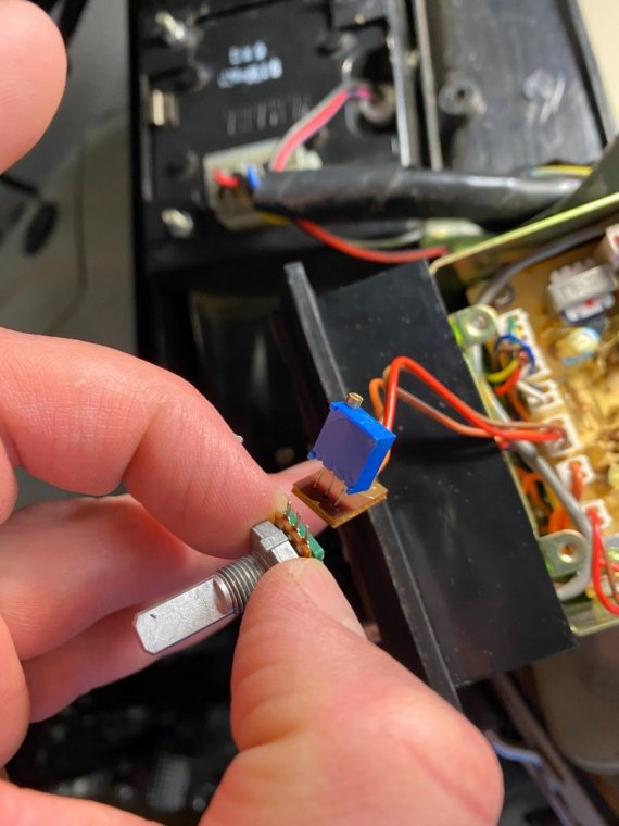 So I still have no idea why it was displaying a “7” but that seems to be gone. Up until today I have been overly impressed with the engineering and quality of this machine. Maybe the CB units were outsourced but I came across the most inappropriate design for attaching fly wires to a circuit card. Most of the wires have broken strands. They thought it a good idea to solder 26 AWG stranded copper to a surface pad. Not even plated strands. Anyway I put the OEM design back in place and bench tested the squelch Pot which failed. Radio Shack didn’t have a 50k of the right dimension in stock but for a couple bucks I bought one electrically correct to perform another bench test. Everything seems to work correct now. I tested with my truck cb and it receives well and will transmit static to my truck when PTT is exercised. I tried using a 5pin cobra mic that I had laying around but it didn’t transmit, I’m guessing some incompatibility with multiple buttons. Now to find a Pot of the right size and electrical spec. -
