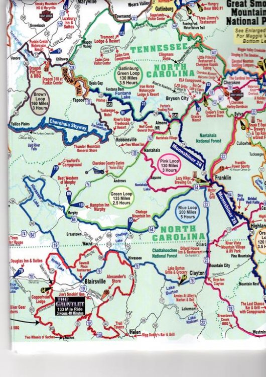 I was out in NC and Tenn riding the Dragon and other assorted ride and picked up a very nice touring map with a lot of the rides in the Tenn, NC, and surrounding states listed with mileage and estimate riding time. This was a free map I picked up at Bush's Beans visitor center off of hwy 441 in Tenn. There is a web address listed on the map, http://www.wildrides.info . The map might be available from many different locations as one side is nothing but adds for local places. I have also taken a sample scan of the map but it way too big to scan it all and post it here. Rick F.