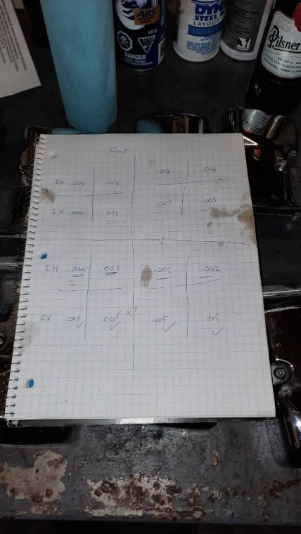 Little update, Turns out that the head bolts can be tightened with the cams in place. Figured this out AFTER pulling the rear cams🙄... Anyhow, pull the rubber plugs on top of the cam caps and then turn the engine slowly until the through holes in the cam shafts line up with the holes in the caps. At this point, you can pass a long 8mm Allen key bit through the hole and start torquing. You'll only be able to do the front or rear cam at a time, so to tighten evenly you should have to turn the engine over a few times by hand. I would say most of the bolts took about 1/4 turn before clicking over but at least 4 took over a half turn after unsticking a bit, I was worried they may be stripped but they did click eventually! Double checked all the bolts again and they all clicked at the proper torque now. Had some fun resetting the timing with all the valve springs fighting me(don't pull cams if you can help it!) But one I figured out the trick it wasn't too bad. Now the next step is to adjust pretty much ALL of my valve shims, I think previous owner set the tighter I stead of looser thinking it would be better. One shim was upside down so I am not thinking it was factory. Below are the measurements found.
