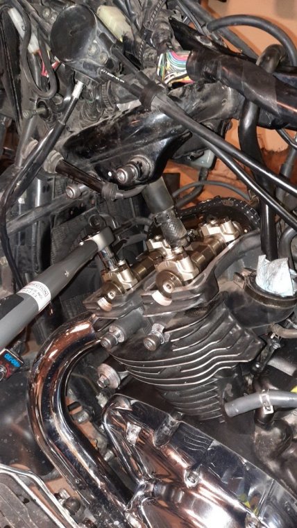 I have seen this trick mentioned briefly when doing some researched but the replies were mostly along the lines of it being sketchy or difficult. In fact it works very well and I have used this trick on both my FJ600 and now my RSTD. Use a good thick ziptie and there is no risk of it getting cut by the valve. The method I use is this: 1) Bend a heavy(thick) zip tie to 90 degrees by pinching it with pliers, make sure that the short leg is 1-3/4" long to reach the valve. 2) Turn the engine over until the cams are pushing down the valves and insert the zip tie with the stem facing between the pair of valves you want to check. 3) turn the zip tie gently to one side until you feel light contact or about 20 degrees, then while holding it there, slowly turn over the engine until you feel the valve grab the zip tie. If you miss, try lowering the valve and try again. 4) If you caught it, properly, you can keep turning until you have enough room to pry out the shim from the bucket and grab it with a magnet as usual. 5) when do e, just turn the engine slowly backwards until it let's the zip tie go. Then you can wash, rinse and repeat for the remaining valves. Hope this helps the other cheap buggers like me who don't have the tool handy!