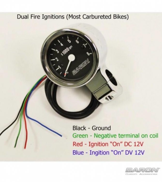 Du-Ron, thanks. No diagram, but wired as noted on Barons PDF page one. And also following Freebird's article in the Second Gen tech section here. http://www.venturerider.org/forum/showthread.php?8810-Tachometer-Install No add on, no modules. What is "single fire adapter"? This is just the bullet tach, with 4 wires. Put red and yellow to coil positive (red/black) and the green to coil neg (white) and then the black ground to chassis. That matches the Baron's instructions for "without module". Like I said, I'll pull this and try it on my old RSTD which is 6 feet away. Thanks, Mike G. #EDIT - I just went back and looked at the Baron's PDF. I see the adapter at the bottom. It sounds like I need to check into it. But looks like Barons is unmanned anymore. video below...... says a single fire system needs the tach adapter, a dual system does not. Which do we have on the RSV/RSTD? It sounds like I should not need it,, but? But the tach came from someone on this forum, so I "assumed" it was complete. Might be that the PO took it off his bike and did not know the adapter was part of it. ??? Du-Ron, thanks again for pointing it out. Mike G. Barons tach adapter also available from Dennis Kirk: https://www.baronscustom.com/catalog/display/243/index.html Video from Barons -
