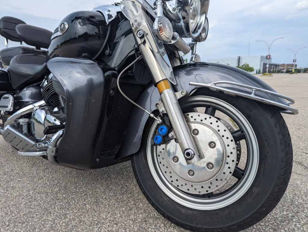 I was finally able to get my new (to me) brake calipers installed onto my 2005 RSTD. Same works on 99-13 RSV. @skydoc_17 (Earl) sourced the calipers, stainless steel brake line and appropriate banjo bolts for the conversion. Earl was excellent to deal with as well. The install was straight forward and worked great. I picked up new EBC sintered brake pads for the new parts. My donor bike was a Yamaha R6 that was hit in the rear end. Fresh DOT4 fluid was installed at the same time. The improved stopping power is noticeably immediately. My Blue Ridge Parkway trip last month was the real test and I was hugely impressed and very confident with my new stopping power. This is a highly recommended upgrade for your RSTD or RSV.