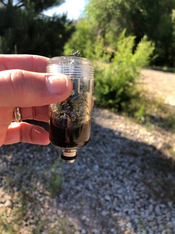 So, a quick update on this little project after ~4k miles. It has held up well and seems to be doing what I hoped it would - catching oil droplets before they get sucked into the airbox. Attached is the oil collected after the 4k miles since installing. I have not pulled the tank to inspect the airbox or #1 carb closely but just doing a quick visual look up under the tank, I do not see the buildup of oil residue that was previously occurring on #1 (left/shifter side, rear). -