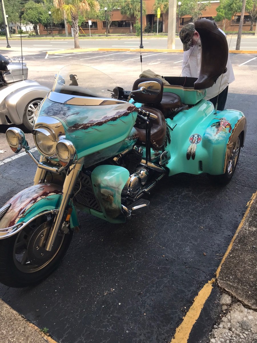 A good friend, Ken, bought this 05 trike last July that was originally owned by EDS. His 03 had much custom artwork and over the last year he, with a little help from me, transitioned most of the paintwork and chrome forks over to the trike. Last thing was matching the silver body. That was recently completed and last week we mounted the body. End result looks pretty awesome.