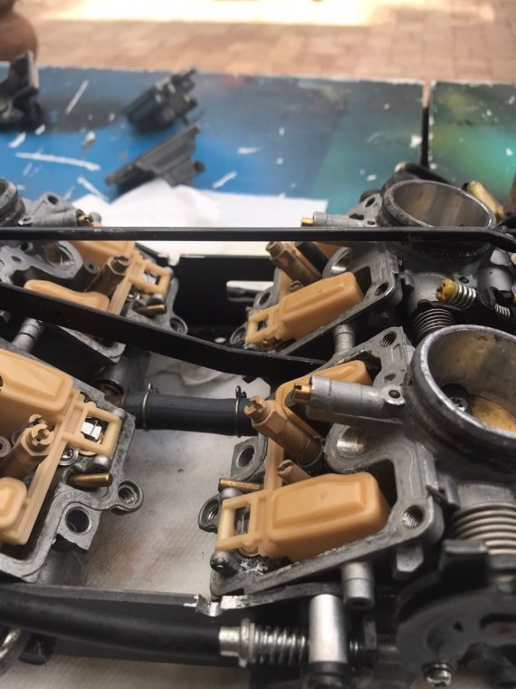 If your removing your floats you will find those alignment supports in the way of removing the pin holding the float on two sides. A simple solution was to take a dremel and cut a notch into the support deep enough to clear the pin. Make sure you cover all carb openings including the fuel inlet before grinding. You can unscrew that idle adjustment screw for clearance. Don’t loose the spring.