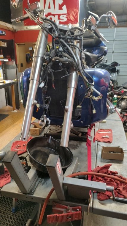 I am going to start with finding a good way to jack the front end up I am open for any suggestions on the matter at hand of getting to the servicing of these type of forks