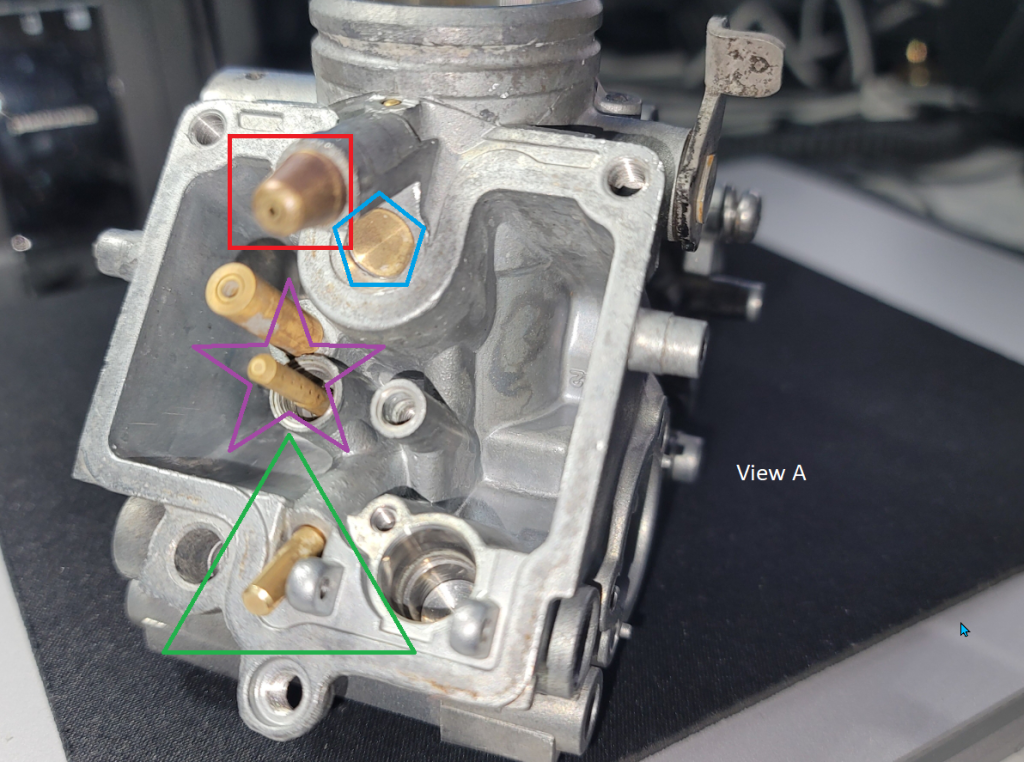 In View A: Does the Red Square cover the Pilot Gas Screw?  Or is it under the Blue Pentagon?  What is the the brass piece identified in the Green Triangle?  It appears to aligned with the needle jet, which is what I think I want to remove, but is may be pressed in.  Is the emulsion tube identified within the Purple Star?  Can it come out to clean it?