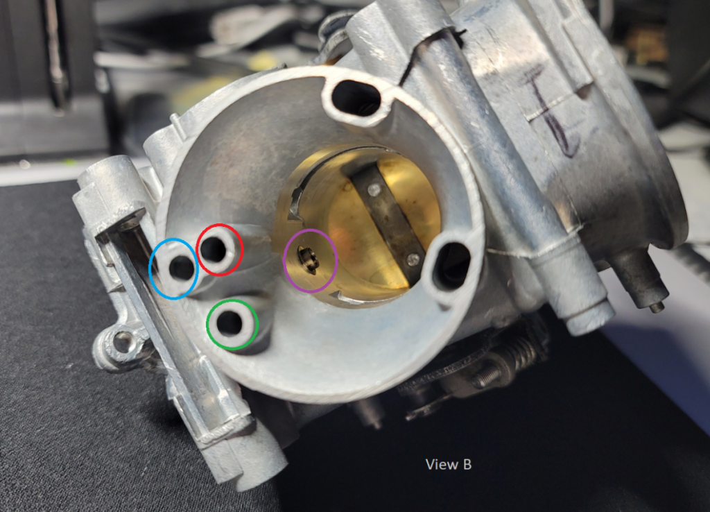 In View B: What are the Blue, Red and Green ports.  Also, the Purple circle I think is the needle jet that leads to the emulsion tube, but apparently not directly, see the Purple Star in View A.  Can it come out. . . .how?