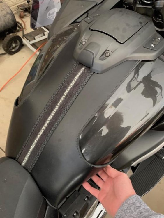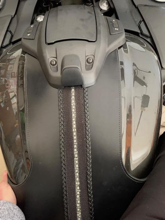 I've been working with Nanci at https://www.acehighleathers.com on a tank bib/chap combination for the Star Venture. Nanci has done great work for a lot of our members here and I'm always amazed at the quality of her products. This particular bib is made from cowhide with a strip of stingray down the middle. I love the way it turned out. The pictures do not do it justice because it is just too cold in my garage and I'm not going to install it properly until it warms up outside. Probably in the spring. I don't want to pull the backing off the velcro strips that adhere under the tank and can't pull it all tight until then. Also, the leather is very cold and stiff right now. I could heat everything up with a hair dryer I suppose but I'll just wait until the weather is better. At any rate, I just wanted you to get an idea. All her work is custom so she can do pretty much whatever you want. This is the first one she has done for the new Star Venture and it fits really good considering the not so great measurements that I sent her. I actually think it's going to be about perfect once things warm up and I get get it installed correctly. I usually get a pocket on my bibs but with the storage availability on this bike, I decided that I really didn't need one. The main reason for adding it was that I think they look great and the "whale tail" protects the side of the tank where your knees rub it.