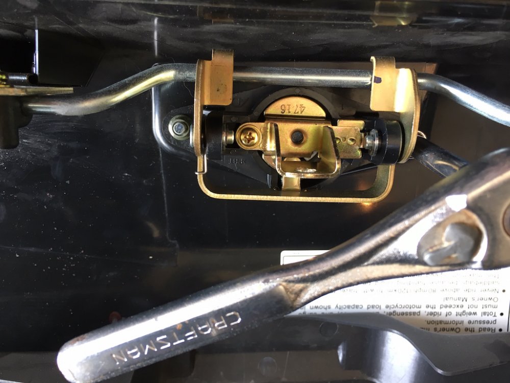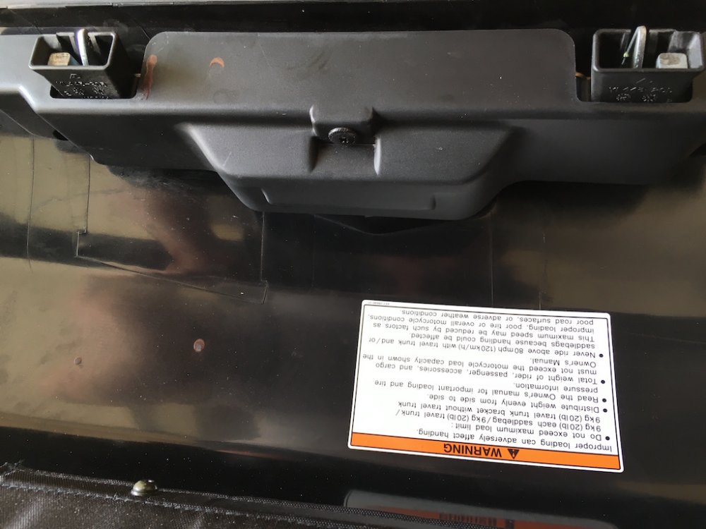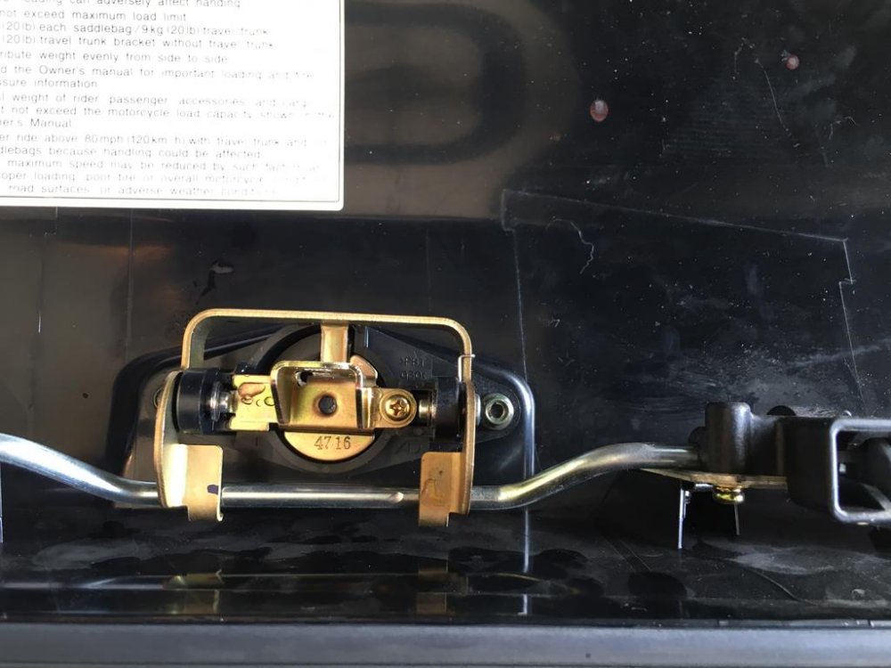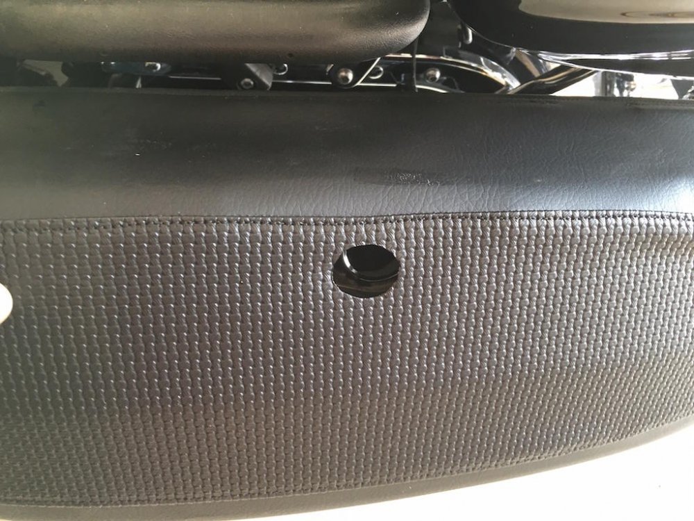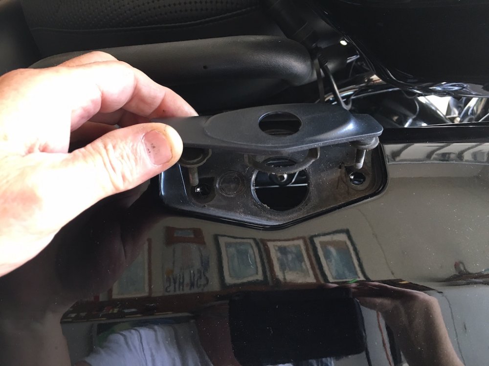 Quite a few of us have purchased the excellent saddlebag lid covers that Nanci, @Luvdaleather , makes. She was never happy with the hole that she cuts for the push button/lock protrudes though. Due to the stretching required to install the covers and get a tight fit, the hole never perfectly lines up with the button. Nanci asked me if I would experiment with mine and see if it would love better if the cover was placed under the black plastic surround of the button. So I did it and she and I both like the look a lot better. Nanci asked me to take some pictures of the install and post it here and I am more than happy to do so. This is not complicated and not a fancy write-up but you will get the idea. First thing to do is to open the bag and you'll see the plastic cover over the latch mechanism. There are three plastic fasteners that you will remove and then the cover will just lift off. Then simple remove the two 10mm nuts that secure the lock mechanism. You can then simply lift the lock and button out of the lid. Now the plastic surround may just fall out like shown in the picture above but probably will have to be lifted out from the outside. It has two studs attached to it and may have to be gently worked out of the holes. It will come out easily either way. Now secure the cover to the top of the bag gently stretching as necessary and using the clips sewn onto the cover. Using a scratch awl or even a philips screwdriver, punch holes through the cover from the inside of the bag. From the outside, press the plastic surround's studs through the punched holes. Press it in all the way. Your vinyl or leather should stretch enough so that it fits just as it did before. Push the button back through the plastic surround and install and tighten the two nuts. Replace the plastic cover with the three push pin fasteners and you are done.