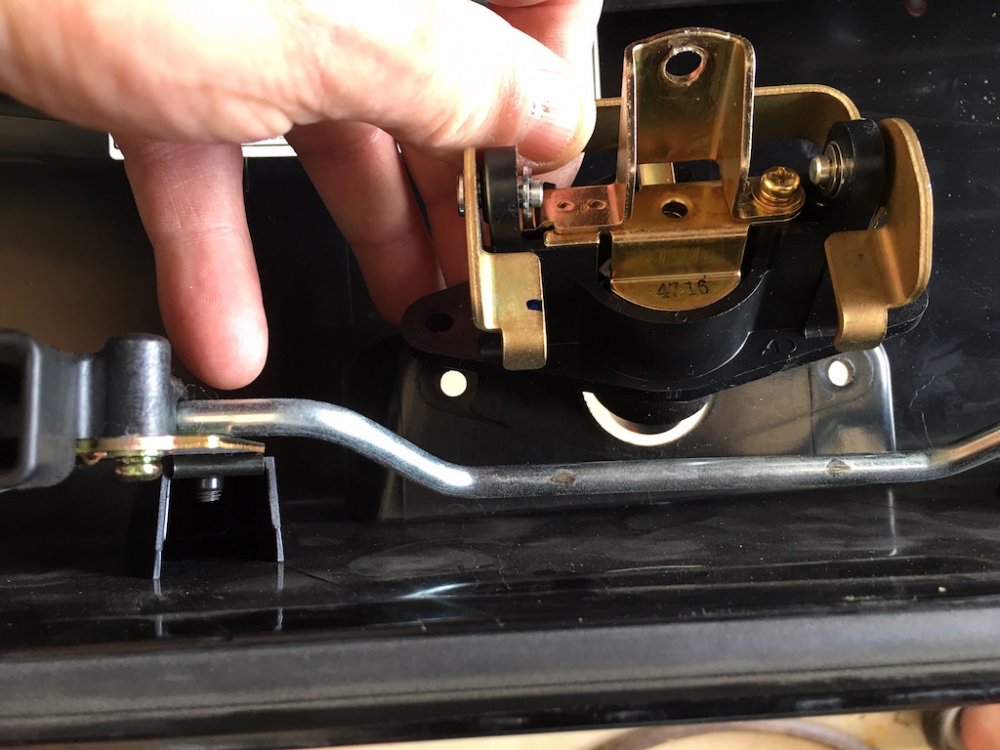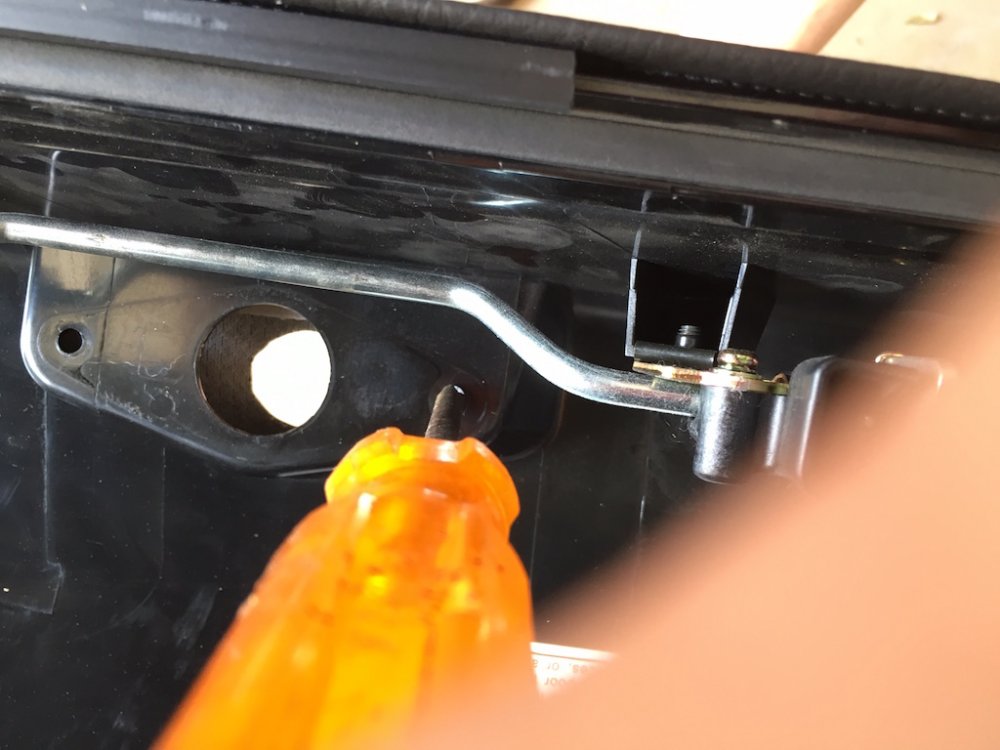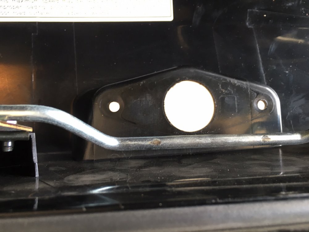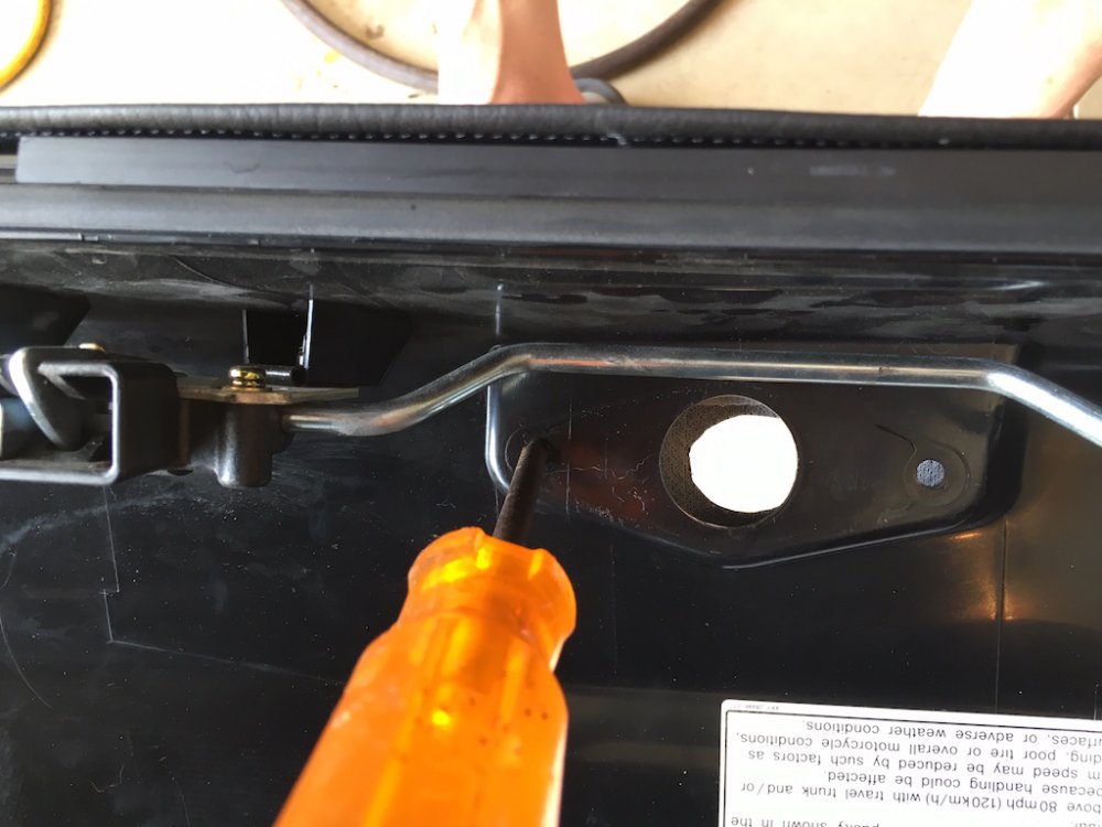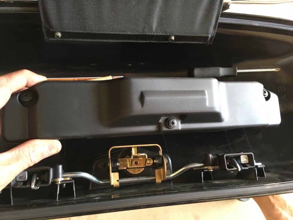 Quite a few of us have purchased the excellent saddlebag lid covers that Nanci, @Luvdaleather , makes. She was never happy with the hole that she cuts for the push button/lock protrudes though. Due to the stretching required to install the covers and get a tight fit, the hole never perfectly lines up with the button. Nanci asked me if I would experiment with mine and see if it would love better if the cover was placed under the black plastic surround of the button. So I did it and she and I both like the look a lot better. Nanci asked me to take some pictures of the install and post it here and I am more than happy to do so. This is not complicated and not a fancy write-up but you will get the idea. First thing to do is to open the bag and you'll see the plastic cover over the latch mechanism. There are three plastic fasteners that you will remove and then the cover will just lift off. Then simple remove the two 10mm nuts that secure the lock mechanism. You can then simply lift the lock and button out of the lid. Now the plastic surround may just fall out like shown in the picture above but probably will have to be lifted out from the outside. It has two studs attached to it and may have to be gently worked out of the holes. It will come out easily either way. Now secure the cover to the top of the bag gently stretching as necessary and using the clips sewn onto the cover. Using a scratch awl or even a philips screwdriver, punch holes through the cover from the inside of the bag. From the outside, press the plastic surround's studs through the punched holes. Press it in all the way. Your vinyl or leather should stretch enough so that it fits just as it did before. Push the button back through the plastic surround and install and tighten the two nuts. Replace the plastic cover with the three push pin fasteners and you are done.