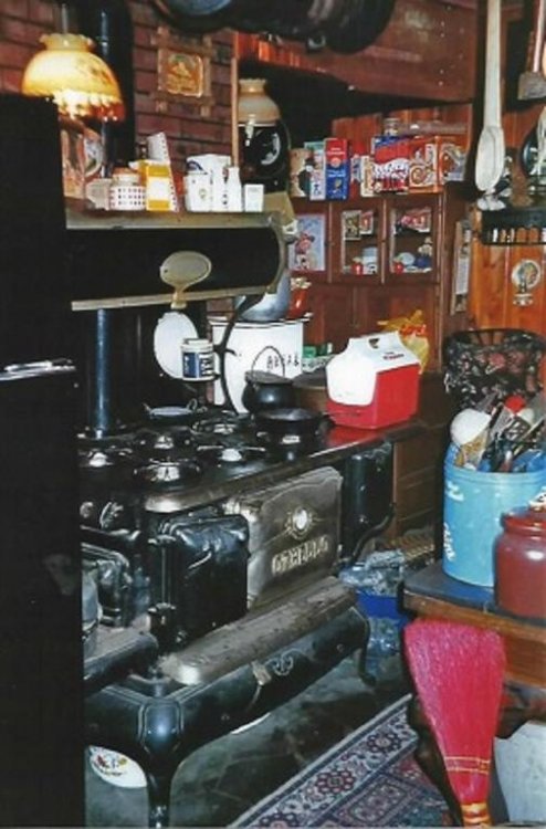 That stove was a display piece at a Dutch Pantry restaurant that had closed. I was a few years into my trade at the time, and went through a bit of effort to convert it to a gas burning stove. That was back before we had computers, and I had to pour through a catalogue from a local appliance parts store to figure what I could mount, and safely supply gas to....ordered the parts and put it all together. Pilot lights, knobs, and all. The knobs were hidden behind one of the cast iron covers. (Where you'd access the grate shaker) I would have taken that stove since when Dad was getting rid of stuff to sell the house, since my home now is kinda rustic, but I thought he would have gotten a good $ for it. I found out later that it sold at the auction for $300. A bunch of stuff went for pennies that I'd have loved to have. Serves me right for not being willing to take hardly anything when Dad told me to take whatever I wanted.....I felt he could use the money more than I could use the stuff. Within a year after Mom passed ( 98 ) All that stuff was gone, and Dad moved into a smaller house that we'd remodeled for him. I drive by the house nowadays, and see that it's being let go. The whole neighborhood on the Upper Southside of Youngstown had turned bad.... I don't think I'd care to see the inside. The stone fireplace was built by Dad, with stones we pulled from the creek up at the hunting cabin. The grey woodstove IS in my house now. It's the stove Grandma cooked for Dad on in the 1920s in Wilksbarre, PA. I have it set up for wood heat, but it's so inefficient that I rarely use it. That was a great home and neighborhood to grow up in, but alas, urban sprawl has taken it's toll on that whole area. Sad. That's probably why I live out in the boonies now.