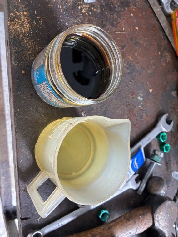 Update on the Venture engine. I changed oil today and put 3.9 quarts, OK. I put the whole gallon in, and put the used oil in the gallon jug. It filled the jug back to just below the level it was before I poured it in the engine. I figure the difference is the amount in the oil filter. This tells me it is not getting gas into the oil, which is very good news. The other side of the coin means I have no idea where the oil in the floor came from. But I know the engine is doing well so I am not going to worry about it.