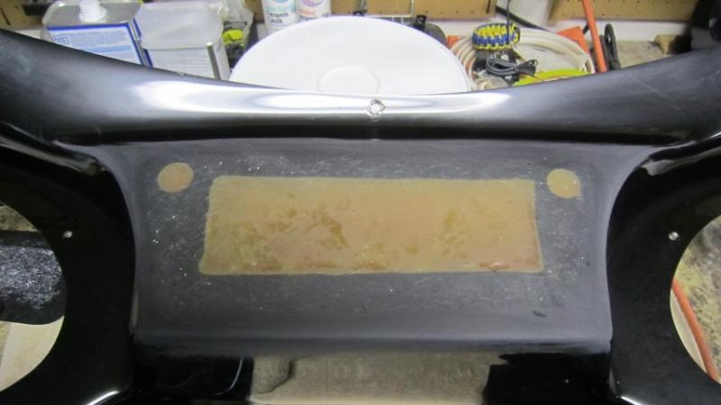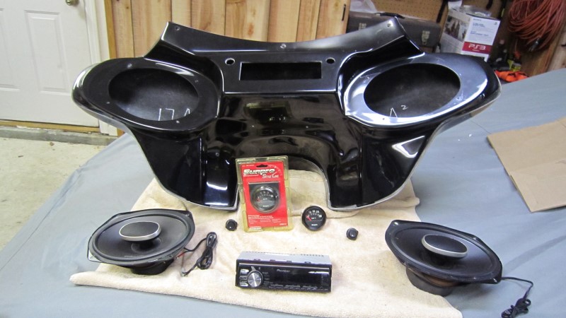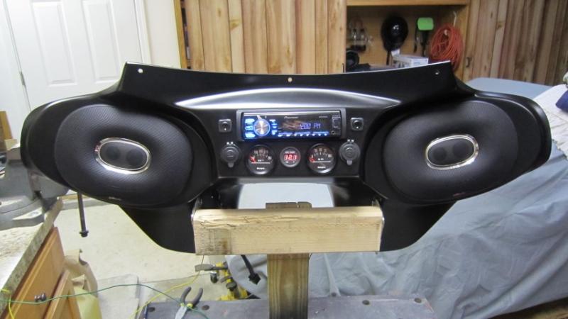 This started the second configuration. I ordered a Pioneer head unit with Bluetooth and aux input. SharkAudio was very good about the return. I just had to pay shipping. I hadn’t modified the fairing, so the cutout for the radio only needed minor sanding to fit right in. I didn’t get any pictures with just the new radio so I’ll move on to the final setup. I ordered an electric oil pressure and water temp gauges from amazon. I also ordered a digital voltmeter with 12v power port and dual USB charger. I fiber glassed the original holes in the fairing to allow space to install the gauges. The next step was to create a template to locate everything. I started with brown paper and then cut it out of plastic. I hadn’t received the voltmeter, power port or USB so those holes will be drilled later. -