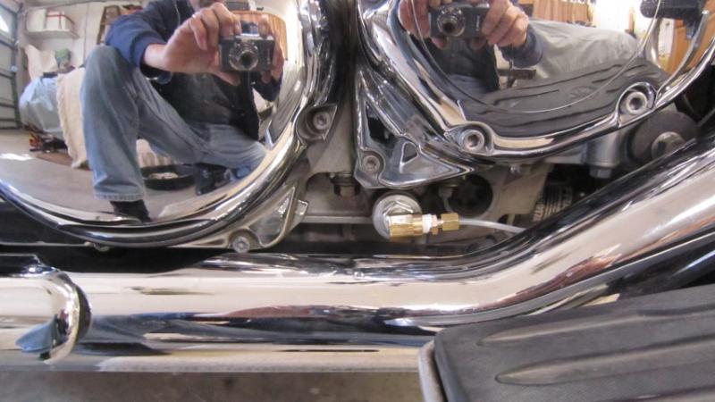 I finished sanding the inner shell and painted it with primer. About then the mail came and I got the volt meter and power plugs. I drilled the holes and painted it satin black. Final assembly of the shell is now complete. I then focused on the sending units. I had bought the plugs form O’Reiley’s Freebird recommended in his gauge post. One note to update Don’s instructions. The plug for the water temp sender needs to be ground to fit in the recess the original plug came from. I also used a copper crush gasket . I found more space under the front frame covers to mount the oil sender. I fabricated the bracket from a pallet banding strap. It’s attached to the mount bolt that holds the bracket for the front airbox mount. Only 5 wires are necessary to power everything in the fairing. (12v constant, 12v ignition, ground, water temp and oil pressure) I found a waterproof 6 pin automotive plug at the junkyard that allows me to remove the fairing like DarrenGT. I also installed 2 switches. The one on the right will kill power to the fairing. (just in case) The one on the right will turn off the voltmeter. All my lights on the dash are blue except the voltmeter. I replaced the gauge lights with blue LED’s. -