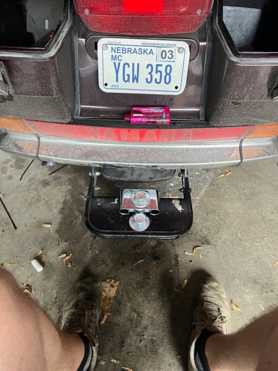 Hey guys. Ever since I got me a nice woman who wants to go on the big camping trips with me I’ve been thinking about storing everything. It’s never been an issue when it’s just me, but now she takes up a whole seat! We pretty much do minimalist camping, but I always bring an assortment of tools with me. We took a short, three day trip to the black hills and mounted the tent on the trunk rack but I HATE having that much weight up there. I’ve never been interested in pulling a trailer, as I want to focus on enjoying the curves and not being concerned with extra wheels, titling, and not really being able to enjoy the bike for what it is… a bike. So I’ve been kicking around the idea of having a rack fabbed for me that was about the width of the bike and maybe 18” deep. I knew I’d have to do some wiring as it’ll easily cover the turn signals. In my research, I found the Rivco quick-attach to be the most appealing but they’re so damn small. Step by step I started putting things together on the bike, starting with the Markland trailer hitch. I’ve had one for awhile but I hate how it mounts behind the exhaust bolts on the MK-II’s but I decided to bite the bullet and install it. It’s really not too bad if you take the passenger floorboard off, but still a PITA. My right muffler is also super close to the saddlebag, almost like the bike has been dropped on the mount or something. Anyway, I got that installed and found a discontinued 30”x18” Rivco rack on eBay with integrated lights and license plate holder for $170 bucks and bit the bullet. i still needed to order the billet aluminum bracket so i ordered that and decided to buy a wiring isolator from an 1800 Goldwing that came pre wired to just plug into the bike for about half price NOS. Well i got everything mounted and wired up today and id say im pretty happy with the result! I took the ball hitch off the Markland hitch and drilled another hole closer to the bike to reduce leverage. Need to either paint everything black or flake the old crappy paint job that the guy I got this from off and get chrome bolts and washers. We’re gonna put a cooler and go for a 360 mile ride with about 35-40lbs in it and see how it rides! Any way I just wanted to show off and upload some pics! IMG_6055.mov