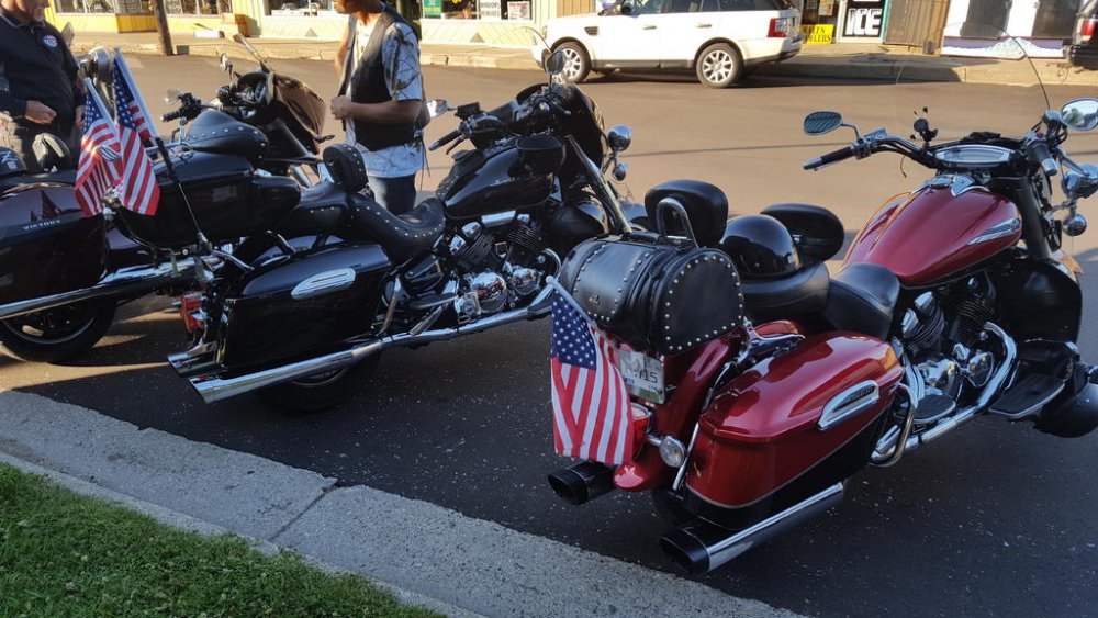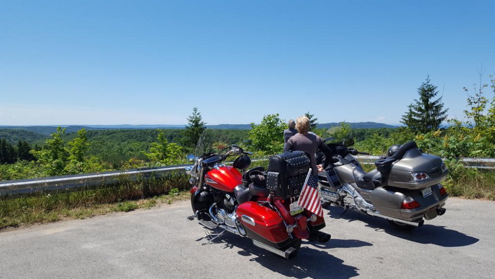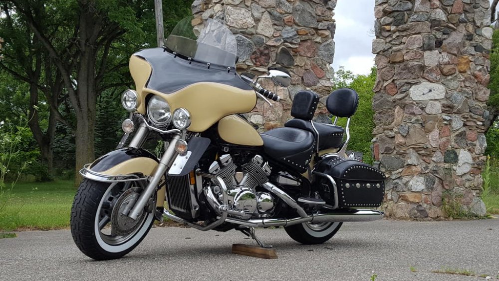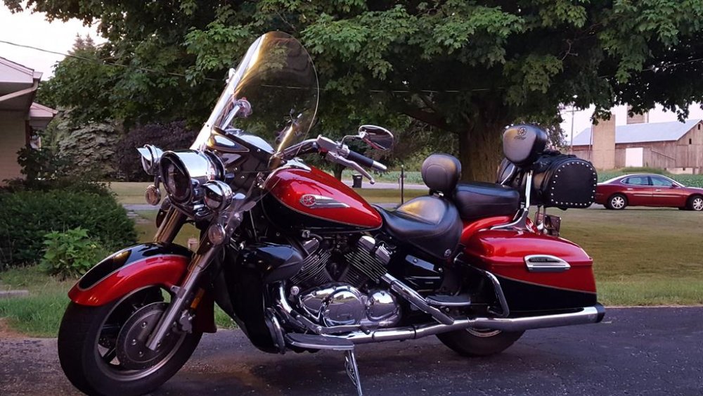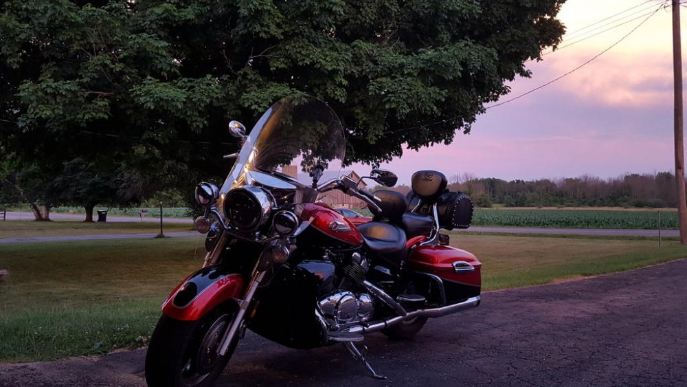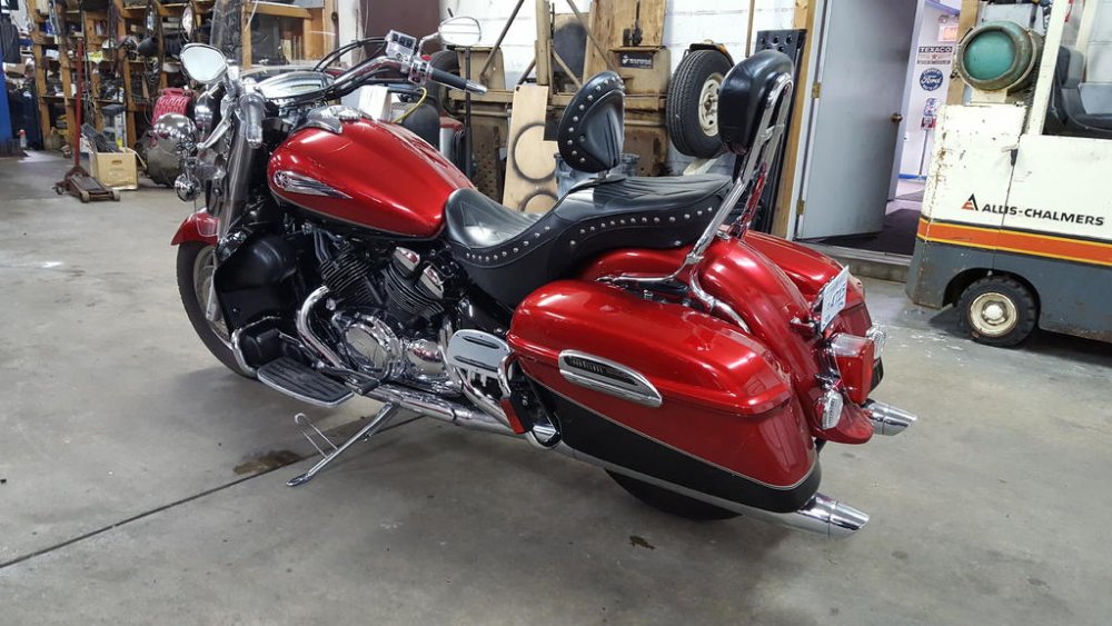 In with the New. Why did we (I say "WE" but really it is my wife's bike, She just lets me take her for rides on it) sell the 97, because opportunity presented itself, in the form of an 07 Royal Star Tour Delux. Since I own a car lot I am always shopping for inventory, well I ran across this 07 with 11K miles on it in West Virginia for $4,000.00. I talked with the owner a few times and decided it would make a nice addition for the car lot inventory, and got it for $4,300.00 including shipping. Figured I could make a cool Grand, and play with it while it was up for sale. It was sitting in the shop when Lori came in to work on a Friday she saw it and it took her breath a little, There has not been another bike that cough both of our eyes enough to consider keeping it and selling the 97, this one did,.. Well long story short (yea, I know "too late") after a few 400 mile weekends we decided we are keeping the 07. With that decision made I had work to to, Transfer lots of parts from the 97 to the 07 before putting it up for sale. Vance and Hines Monster Ovals, Stebel Air Horn, Truck Light LED head and driving lights, etc. But we got it done! Pic of the bike when we got it: And now with the exhaust, Headlights, Luggage rack, gauges, added a 12V charging port, Changed out the Corbin Seats for Mustangs, and a few other misc parts. Lori and I love the bike, We put 725 miles on it over the 4th of July weekend, so it is getting broke in well, The next big project will be replacing the windshield with a Bat-wing Fairing, That will be coming in today. Looking forward to getting that done. We upgraded to a 10 year newer bike, with almost 60K less miles on it. Fuel mileage is Greatly Improved, got 45 45 and 46 MPG on 3 tanks last weekend, with a larger fuel tank, cruising range is 170 to 180 before reserve, instead of 120 with the 97. Love That!!! So when it is all said and done with all of the improvements and selling our old bike it will cost us out of pocket around $1,500.00. That is a lot of upgraded bike for not a lot of money! Happy Riders here!
