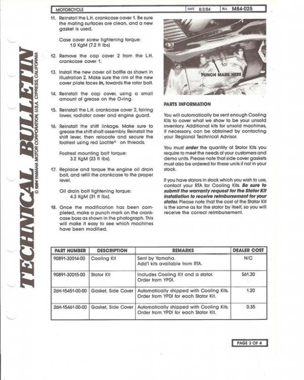I am not sure what four bolts you are talking about, but I suspect you are talking about the four flat head screws with the Torx socket head under the middle gear cover that retain the middle gear retainer plate? If those bolts/screws are what you are wondering about, the "punch" marks on them are in fact staking the bolt/screw heads. The punch marks are made at the factory and do not indicate a repaired thrust washer. There was no dealer applied mark to indicate a repaired second gear. Replacing a worn thrust washer was not a warranty item. Furthermore, a repaired second gear procedure includes replacing the thrust washer and new spec second gear/dog. The "punch mark" that is so often talked about was to indicate that the stator cooling kit had been retrofitted. The single punch mark in that case was supposed to be applied by the dealer onto a smooth blank boss on the crankcase near the middle gear cover. M84-025 Stator Cooling Kit Installation.pdf -