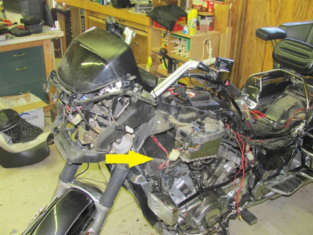 Unfortunately, no matter which of the throttle cables have broken, you will have to remove the left main fairing and the left inner fairing to access the "five into one" junction box. To change ANY of the five cables that junction will have to be accessed and disassembled. My finger is on the junction. The junction is located at the yellow arrow in this pic, behind the inner fairing panel. -