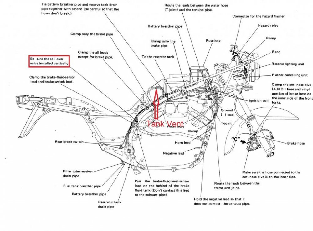 14. The fuel tank vent on the 1984 is a hose connected to an elbow to the right of the fuel filler. In line with hose is a rollover valve. Remove the right sidecover to examine or orient the rollover valve. The rollover valve is a check valve, intended to prevent fuel from escaping in the event of a "rollover" or tip over. The check valve has been known to stick. At least one time, the operator reported that he overfilled the fuel tank. The check valve prevented the fuel from running onto the ground but it also allowed a sufficient "head" of fuel over the check valve that the tank could not vent properly. The hose exits in front of the rear tire (along with the carb vents/overflow).