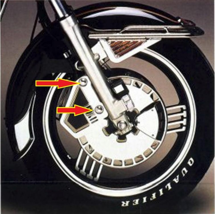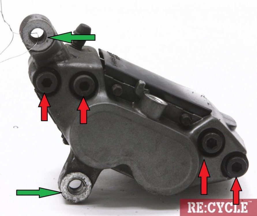 20. Four bolts? Not if it is stock. Only two chromed washer based mounting bolts. Don't be confusing the four hex socket (Allen head) bolts that join the two halves of the caliper as caliper mounting bolts. The caliper mounting bolt holes are in green. The four Allen bolts are in red.