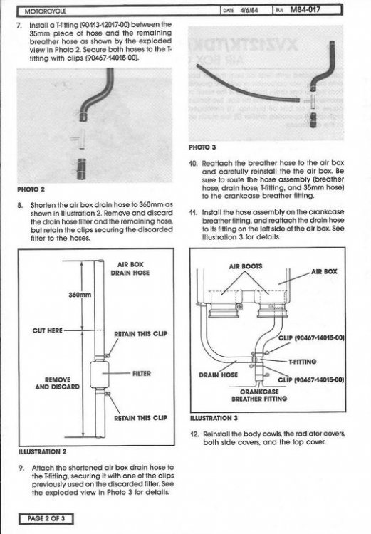18. The purpose of this factory mod was to drain oil that accumulated in the airbox, back to the crankcase. On the 1983's the smaller tube from the airbox drained any accumulated oil to the ground under the left crankcase, through a small inline filter. The larger tube between the airbox and the "twinkie" was only for crankcase ventilation, (think PCV). If the crankcase was not overfilled with oil, there was usually no oil accumulating in the airbox. The trouble with oil in the airbox was that Yamaha specified an excessive amount of oil to be added to the crankcase after an oil and filter change. M84-017 Air Box Oil Leakage .pdf