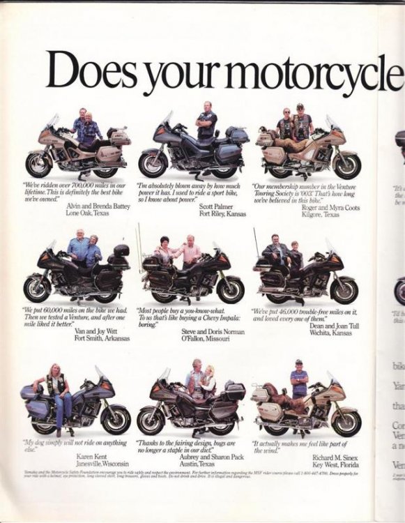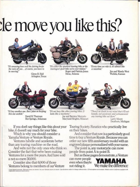 Here is a 'test' post of a Yamaha Venture ad from that 1987 magazine. A jpg scan of the ad(s) is not easily readable in the size that is allowed here, so I scanned it as a pdf. We'll see how that works. Yamaha Venture Advertisement_0001.pdfYamaha Venture Advertisement.pdf -