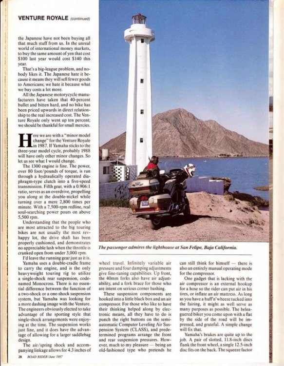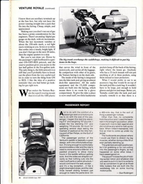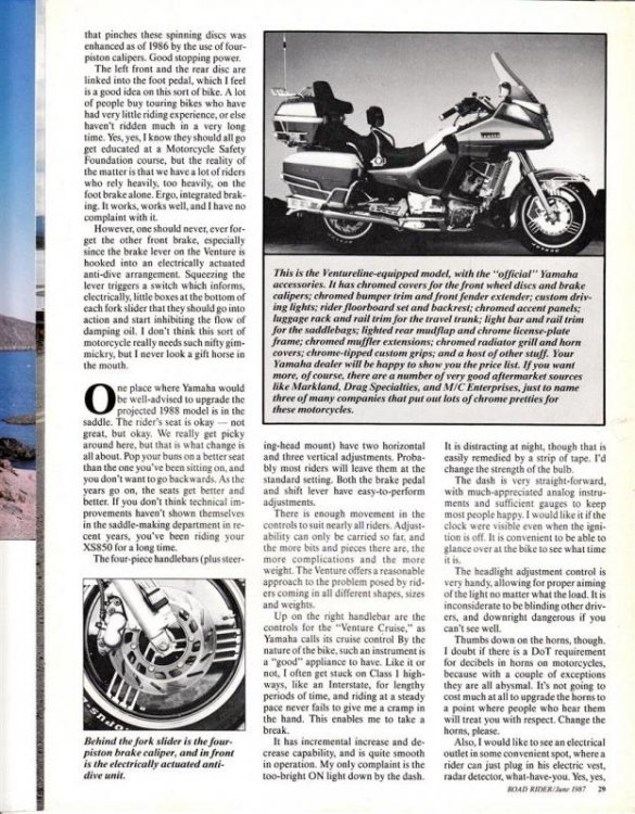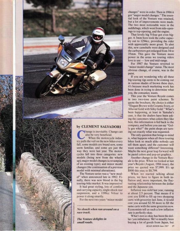 Here are jpg scans of the RoadRider article "Minor Model Changes" about a tour test of the 1987 Venture by Clement Salvadori. If the scans are too small to read, I'll repost the scans as pdf. -