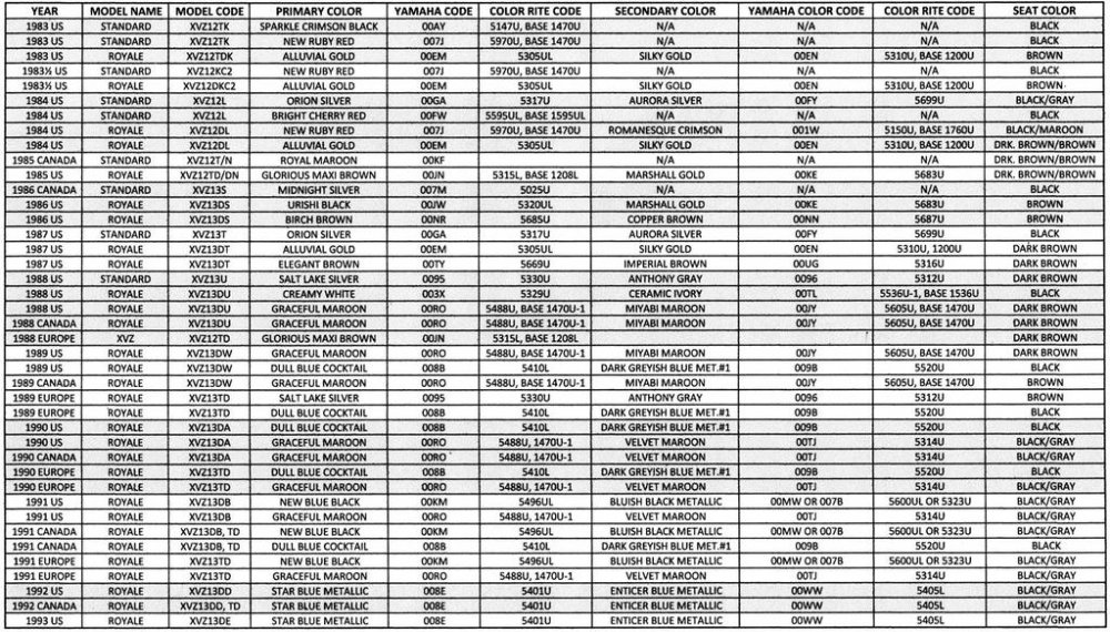 Thanks Prairiehammer Here is the correct colors (with both Yamaha codes and Colorite codes), but as has been said, computer color matching is the only way to get an accurate match of the aged and probably faded paint. [ATTACH=CONFIG]117083[/ATTACH] Venture Paint and Seat Colors.xlsx