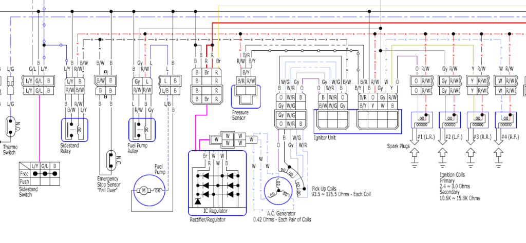 Marcarl is correct. You should have constant 12v to each coil, the ground side of the coil is individually controlled by the TCI. If you look at the schematic you will see that the there is a red/white wire that goes to the 8 pin connector at the TCI , each coil, pressure sensor, fuel pump relay and side stand relay. With ign on you should have 12 volts at each connection point. You should also have constant ground via the black wire 0n the 8 pin plug to the TCI , fuel pump, fuel pump relay, fall over sensor switch, With all the fall over switch, side stand switch and relay all in the normal run position you should also have ground were the black/white wire connects to the TCI at the 6 pin plug. Disconnect the 6 pin plug at the TCI and down by the frame at the stater Which goes to the pick up coils within the stater housing. With an ohmmeter check that you have continuity from the pin on one connector to the pin on the other connector for every wire. Also check the condition of the connector at the stater it is not uncommon for these to turn green in which you would either replace the connectors or just cut them out and hard wire the ends together. If this tests OK perform an ohmmeter test on the pick up coils themselves. With the pickup coil 6 pin connector disconnected check resistance for each coil by connecting one test lead to the black wire and with the other test lead touch each of the other wires you should get ( approx 93.5 to 126.5 ohms ) for each one any one that does meet this spec indicates a pickup coil fault of some sort. Open line reading is an open connection or broken wire to its related coil lower than 93.5 or full continuity would indicate a short of some type.
