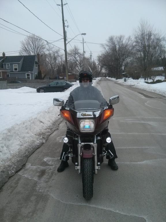 I used to ride all year round, not so much these days mainly because of the new ice-melting crap they use on the roads now because it eats wiring and connectors like crazy. But a beautiful winter day ride can be very invigorating.I wear full face and a snowmobile suit. I even road my 1975 Canam 250 TNT 15 miles through one of the worst snow storms this area has seen back in the mid seventy's and was the only one to make it into work. The deep snow was no challenge to the bike, but coming home on fresh plowed hard packed snow was. .