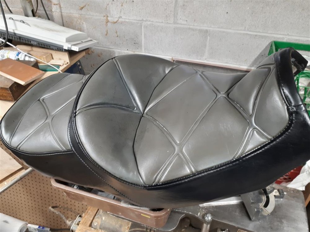 So after trying to clean it with about 15 defferent cleaners the carb and choke cleaner suggested by Marcarl took first price followed by my citra clean. Plus I followed up the carb cleaner with citra cleaner and finally and industrial vinyl treatment similar to armour all.The seat did not com out perfect but I would say a huge 95% improvement. Interesting little thing although the seat is for a MK I it fits the MK II wexcept the passanger seat is a tad smaller. The drivers seat is a tad lower and so I found myself seating about 1 1/2 inches lower and when I took it for a ride I swear it felt like I could handle the twisties even better than when I had the MK II seat. Although the original upholstry on the bike is brown the grey black does not look half bad. I have a black back rest and left rear arm rest so now all I need to do is find a right rear black arm rest and a set of lack pouches. Thanks for the seat Grez007