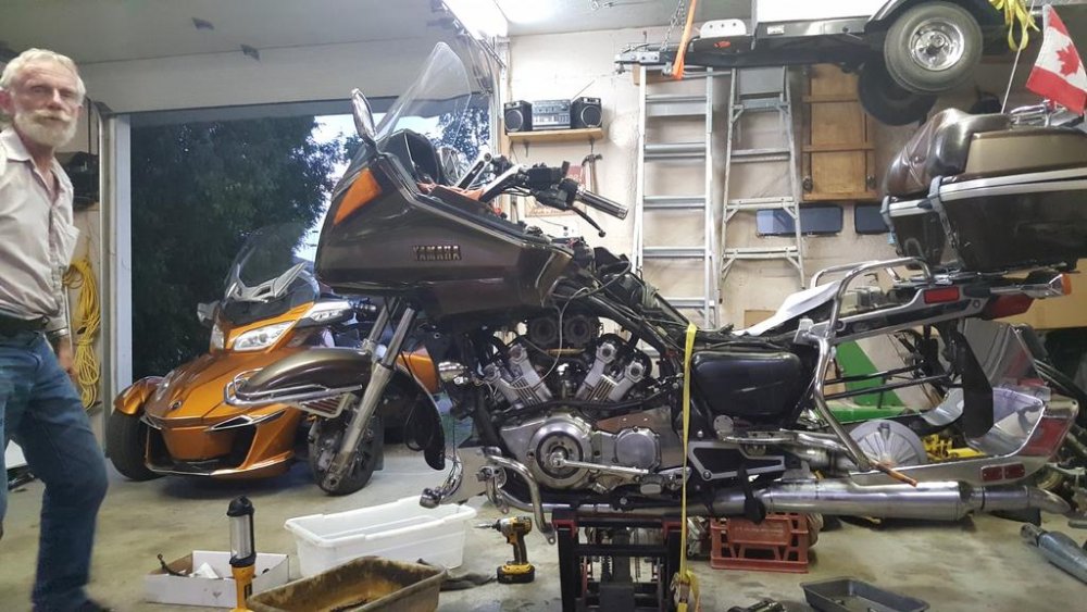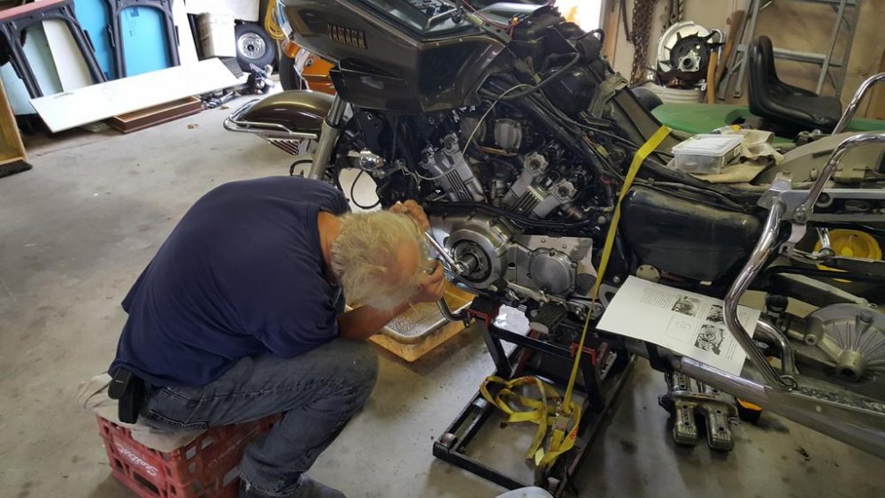 Well, after a 45 min ride in a storm that threw cats and dogs at me and pelted the tops of my cheeks until they were red, I arrived at Carl's thinkin "so we'll change the brake fluid, go get new tires, replace the valve cover gaskets, and lube the pumpkin up good and i'll be on my way." Nothing could have been further from the truth. Not 10 min after my arrival, Carl says to me "how you getting home? Your not expecting to drive this home today are you?" It didn't take long for me to get a really good understanding of where those questions came from. Pulled the tires, splines on the back tire were finished. This is what they should look like. Then Ben shows up and takes off the valve covers to address the gaskets. Well, of course we need to check the gaps and shim any valves that require attention. Valve cover gaskets, and new bolt washers have been ordered. New diaphragms as well. Now, let's talk about the brakes. You know, it makes no sense to change the brake fluid if you aren't sure that the calipers are working properly. So off they come. Three calipers, six stubborn pistons later, they are off and cleaned. New seals have been ordered. At this point it makes perfect sense to decide if you want to delink the brakes, and if your going to do that, you might as well order stainless steel lines because those 31 yr old lines are robbing you of braking power. We are delinking and custom stainless lines will be ordered. When I pulled up at 9:30am, I thought I was going to be out by 4:00pm. Ha! Here's what she looked like when I pulled up at 9:30am. And here's how she looked when I left her at 9:30pm. Am I worried? Not in the least! The two fellas in the photos are the most knowledgeable and trustworthy individuals one could ever have the pleasure to know. I grimaced a few times as the price kept climbing but I came to the realization that a 31 yr old scoot needs attention. So I don't mind spending it if it means I get another decade of pleasure out of this beautiful ride. Besides, I know she's in really good, confident hands. A HUGE thank you to Ben (Saddlebum) and Carl (Marcarl) for the loving attention given to my needy Venture!