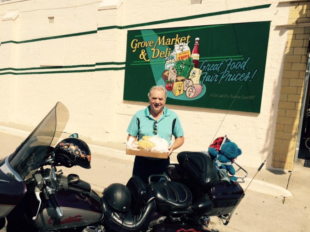 Alan and Annie got an early start this morning for their trip back to OZ. With limited time, Jan and I, decided to take a quick ride into Salt Lake to a favorite spot called Grove's Market. While in the middle of town, this throw back shop is a mom and pop grocery store that sells more in the deluxe sandwiches they make than anything else. When they take their summer vacation, the store is closed for that week or so. Round trip was only about 15 miles but special. We talked about Don (Gunboat) that we had the priviledge to getting to know briefly in May of 2013. We met up with him in Cortez Colorado to pick up a trailer for the Aussies. What a great, easy going gentleman. We shared stories over dinner and then the next morning he came over to the hotel to make sure everything was just right with the trailer and how it hooked up to our bike. Thanks Don for our short but special opportunity!!