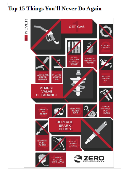 Fellow rider has written extensively about his Zero motorcycles. He believes he's addicted. "I just now got back to my main house in Reno. I put the bike in the Sport mode and still had 40% left when I got here, after riding the bike very hard but more in the direction of the wind. The max speed I can get (indicated-no GPS) was 88 MPH. But I went up a hill at 88 and when I came down the hill it would still do only 88 MPH indicated. Seems nothing effects the top speed in either mode. Level, uphill, downhill all the same top speed. A few MPH indicated less than the spec of 91 MPH. Next ride I will take a GPS and see what it says my top speed really is. But IAC, it's certainly fast enough for me and it sure handles nicely in the turns. The way the thing accelerates is really something with the no clutch and no shifting, I pass everybody from starts by quite a distance. This bike will get it's best MPG in stop and go traffic because every time the throttle is closed while the bike is moving, the battery is being charged by the motor that then becomes a generator. That doesn't happen much on the freeway. BTW, all the Zero bikes have ABS. -Don- Reno, NV" "I think the name Zero means zero emissions, zero maintenance, zero gas, zero vibration, zero shifting, etc. -Don- Reno, NV" http://www.zeromotorcycles.com/zero-fx/specs.php